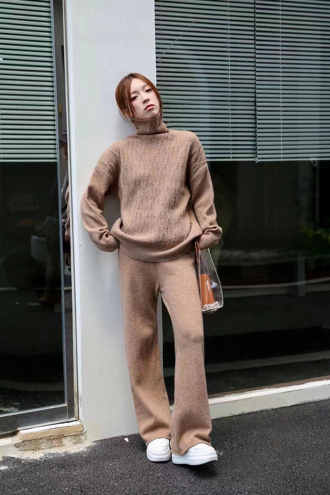 Women Solid Knit Sweater Suit Autumn Winter Casual Turtleneck Pullover High Waist Wide Leg Pants Elegant 2 Piece Sets Lazy Style