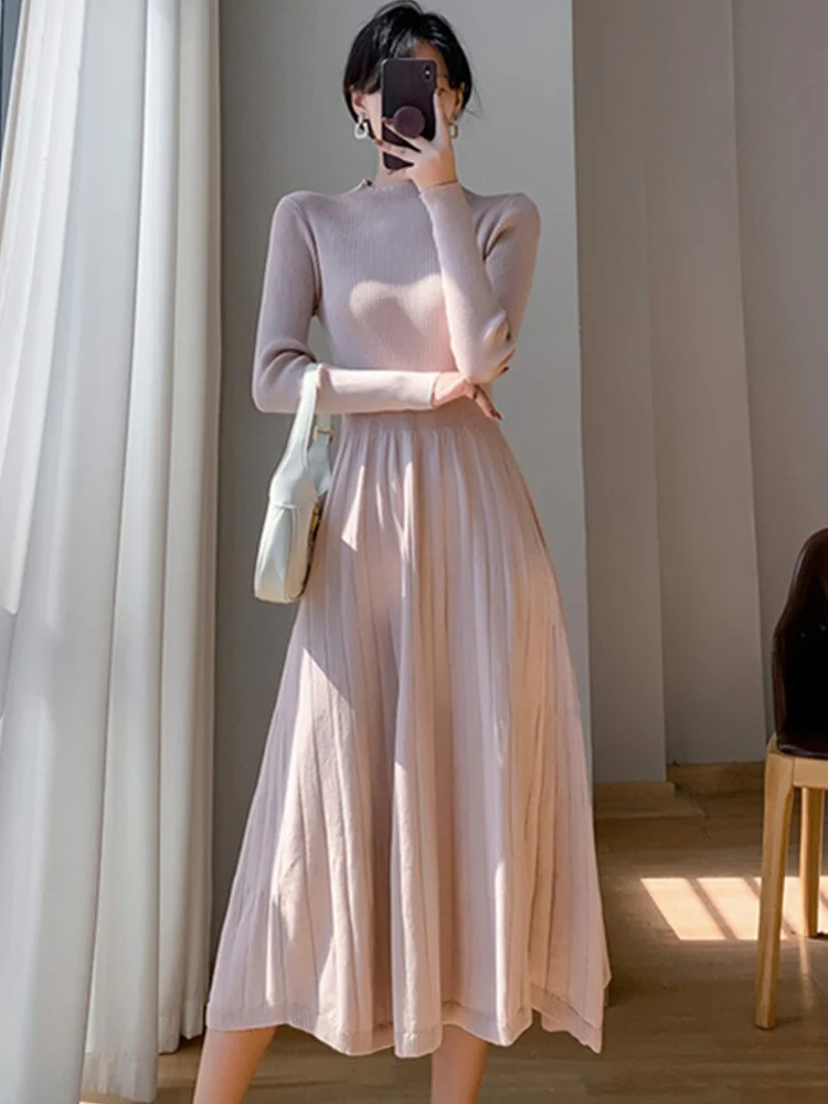 deanwangkt Fashion Chic Knitted Dress Women Autumn Winter Vintage Half High Collar Long Sleeve Solid Dress Slim Office Ladies Dress