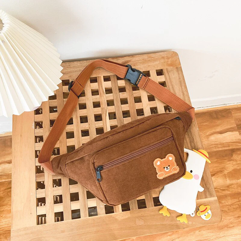 deanwangkt Japanese Kawaii Bag Women Corduroy Chest Bag For Women Cartoon Bear Waist Bag Large Capacity Crossbody Bags Purses Phone Bag