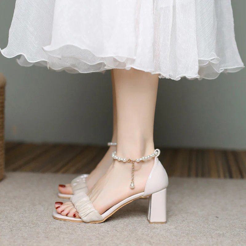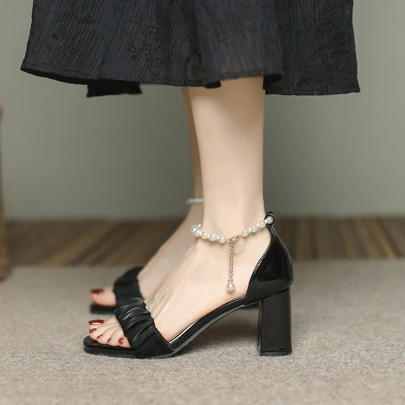 DEANWANGK Summer New Pleated Transparent Thick High Heel Sandals with Chain Square Toe Open Toe Rubber Sole for Women