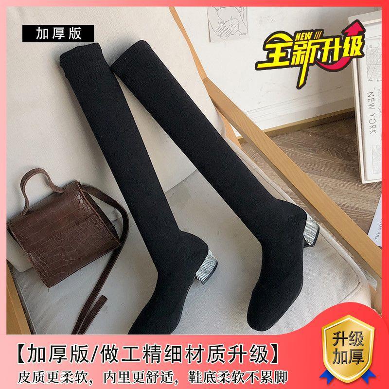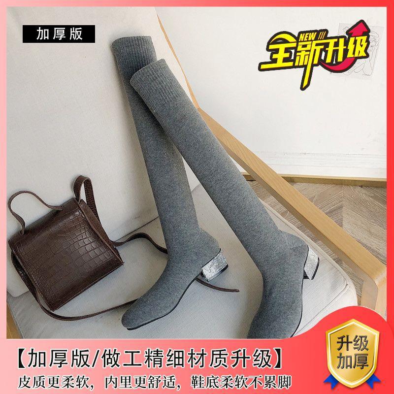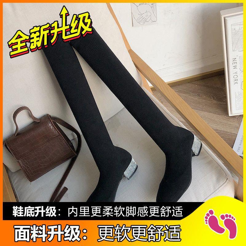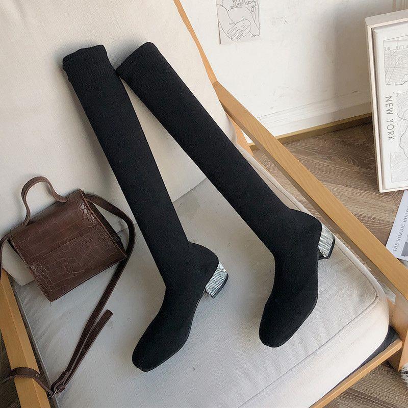 Autumn and Winter New Fashion Korean Style Pantyhose Boots below the Knee High Leg Boot Square Toe Wedge High Heel Pearl Boots