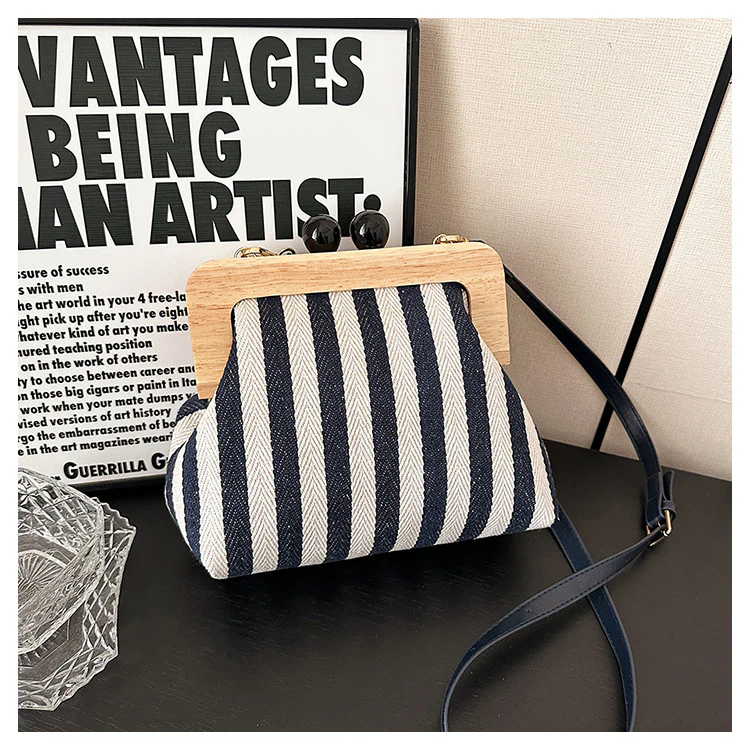 New Women's Bag Striped Canvas Wooden Clip Mouth Clutch Fashion Exquisite Internet Celebrity Same Style One-Shoulder Crossboby Bag
