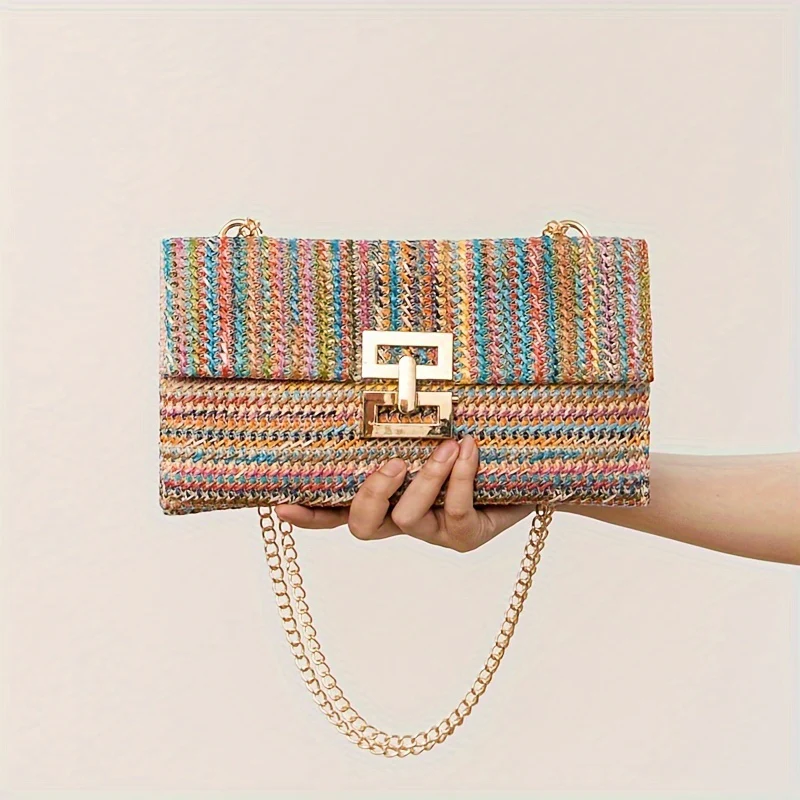 Chic Bohemian & Striped Braided Shoulder Bag - Secure Kiss Lock, Holiday Themed, Polyester Lined, Travel-Ready for Women