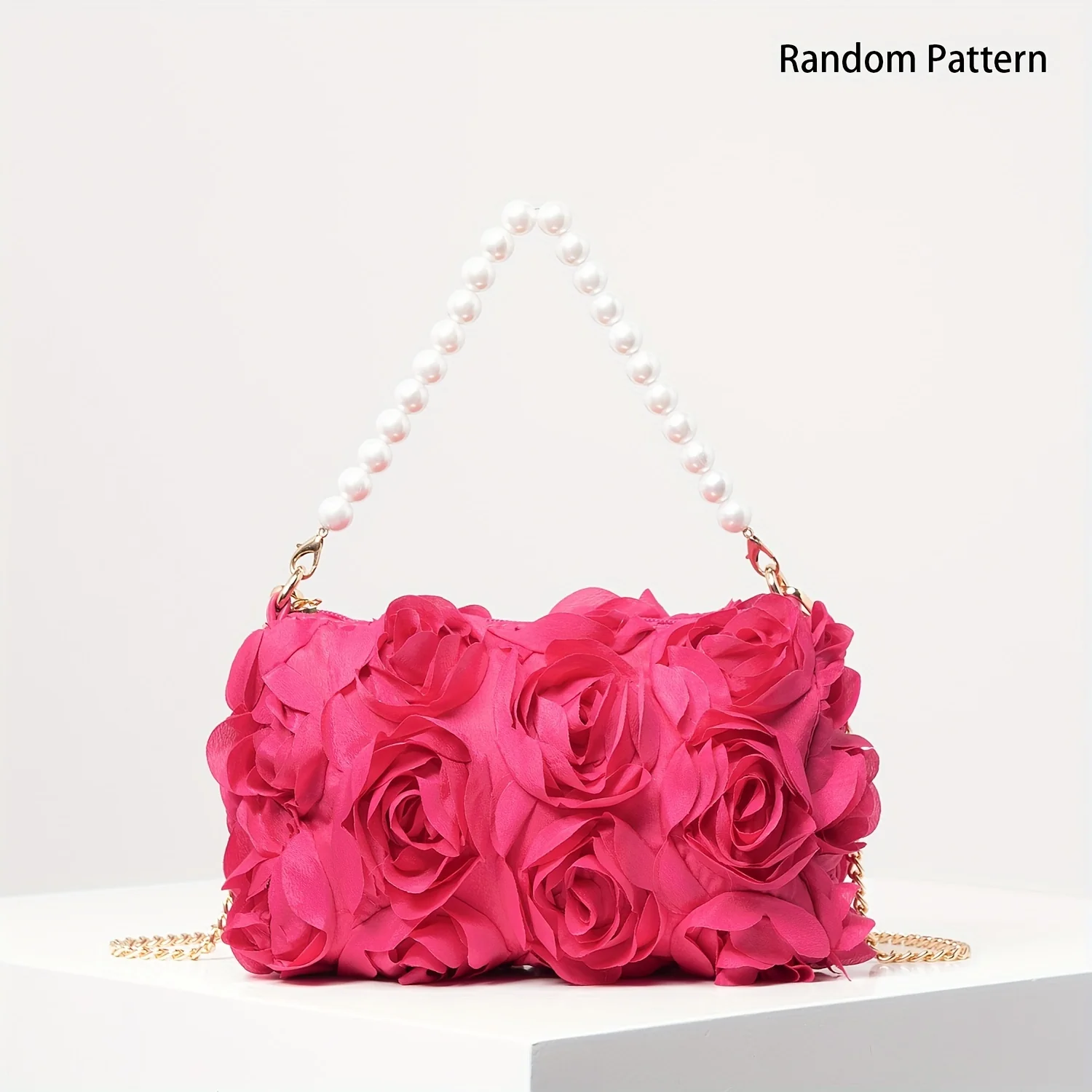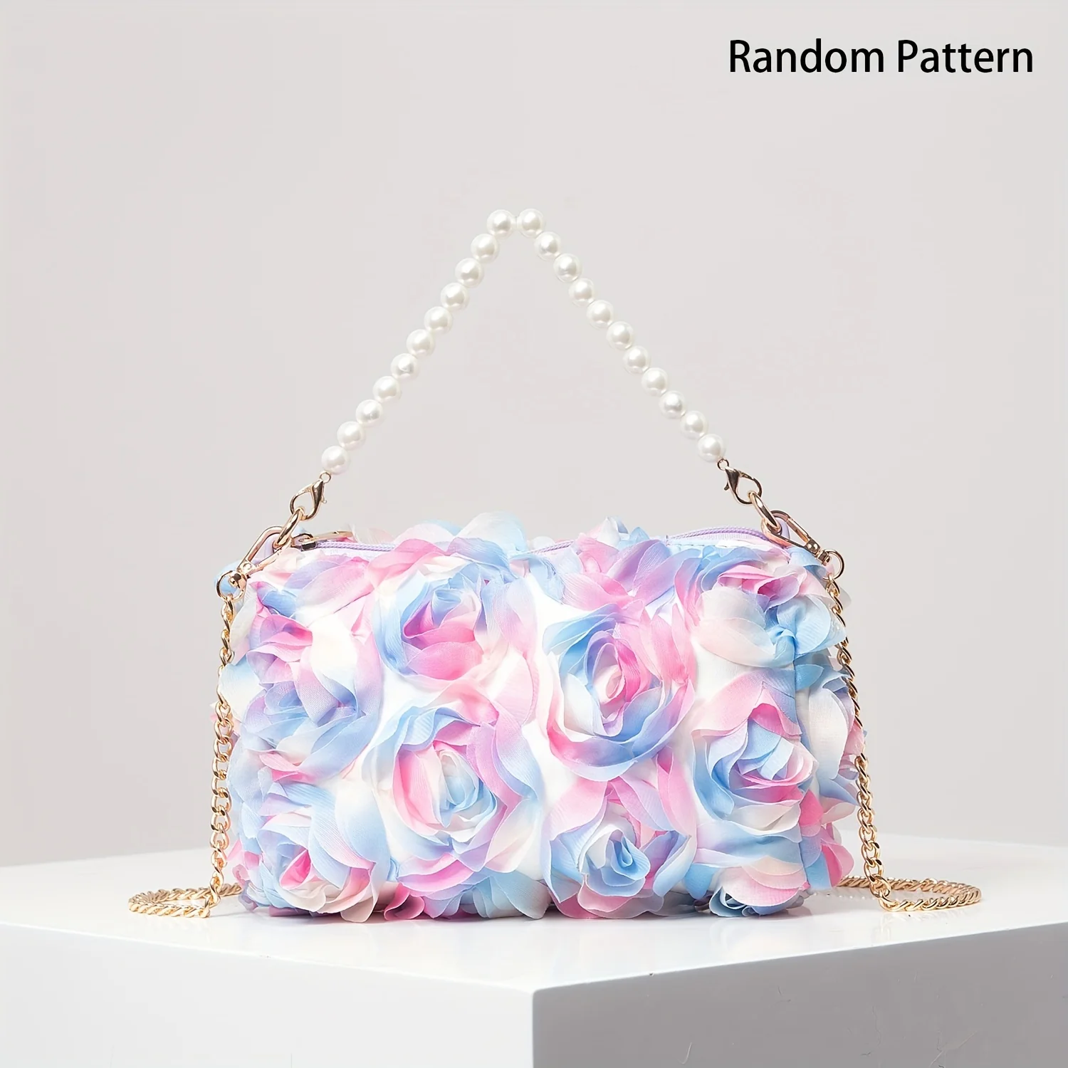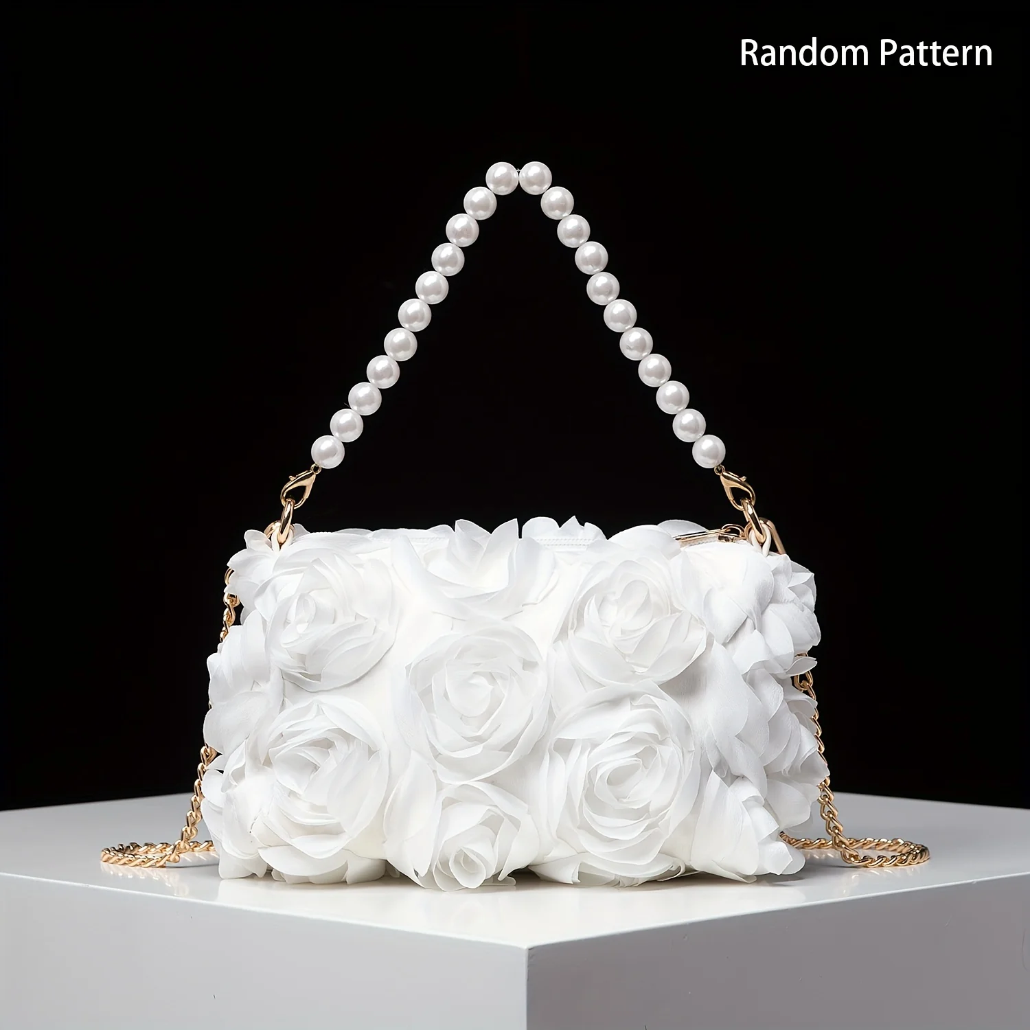 Rose Embroidered Floral Shoulder Chain Bag - Zipper Closure, Beaded Decor Strap, Polyester Lining, Random Printing, Perfect for Valentines Day and Special Occasions