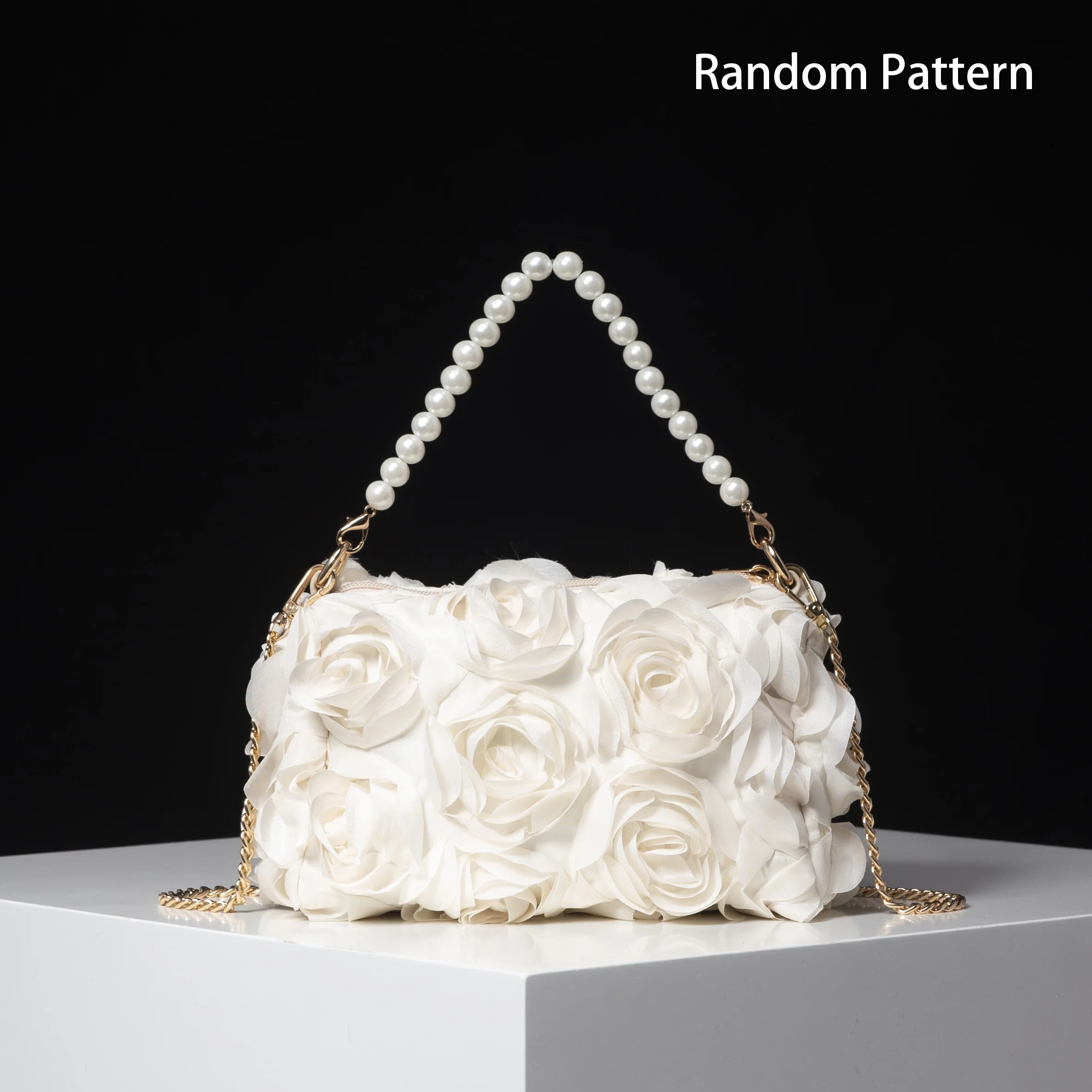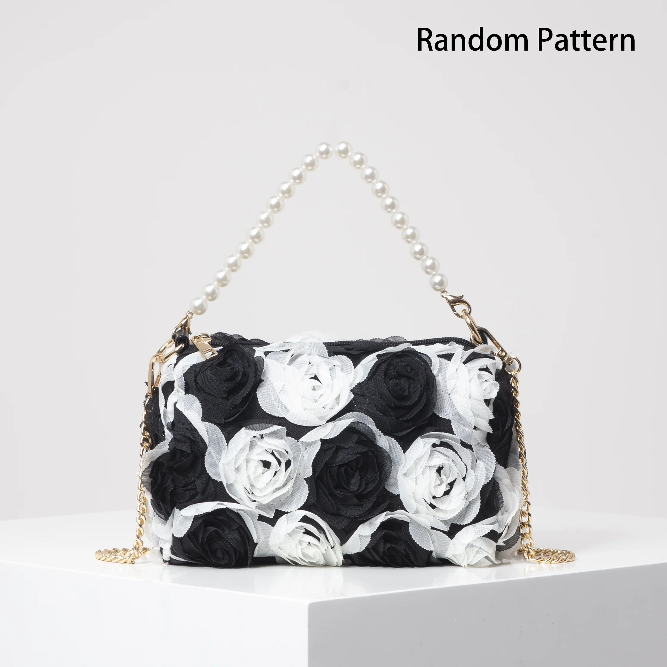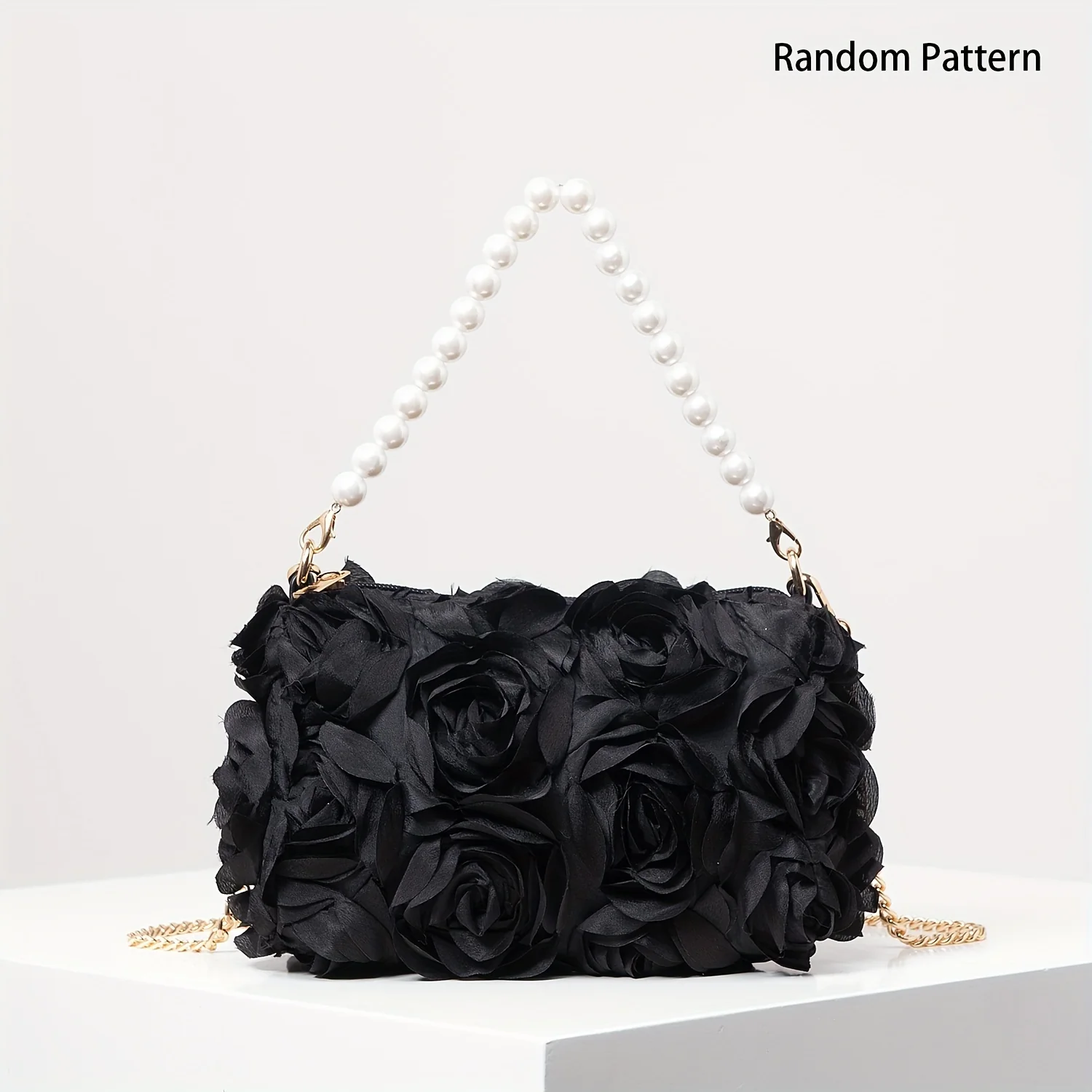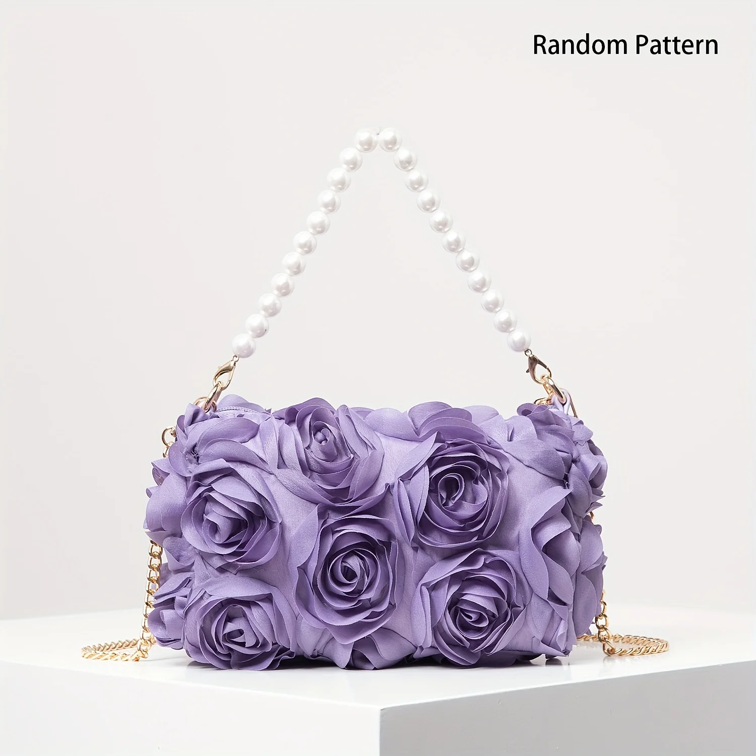 Rose Embroidered Floral Shoulder Chain Bag - Zipper Closure, Beaded Decor Strap, Polyester Lining, Random Printing, Perfect for Valentines Day and Special Occasions