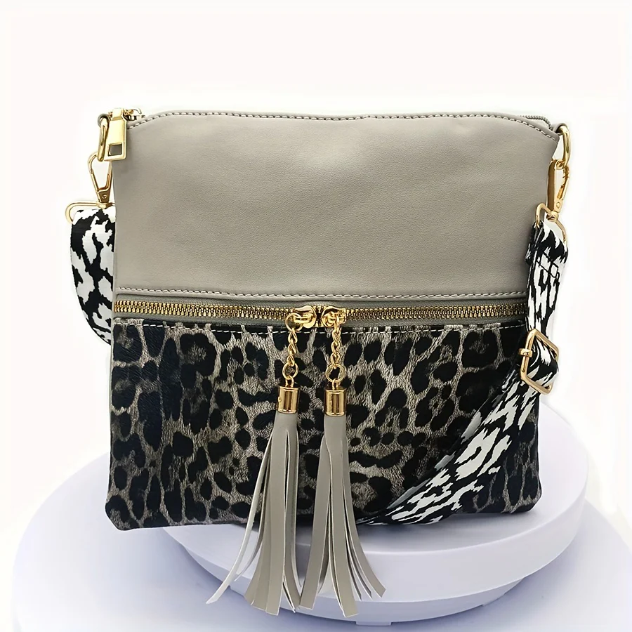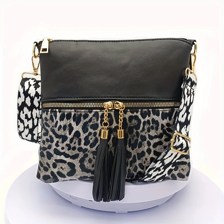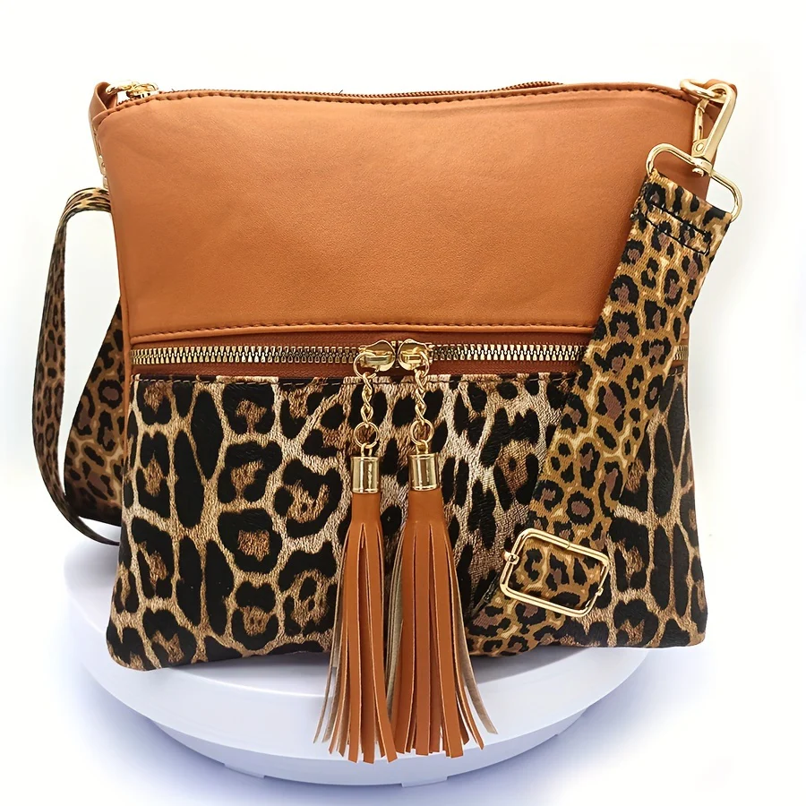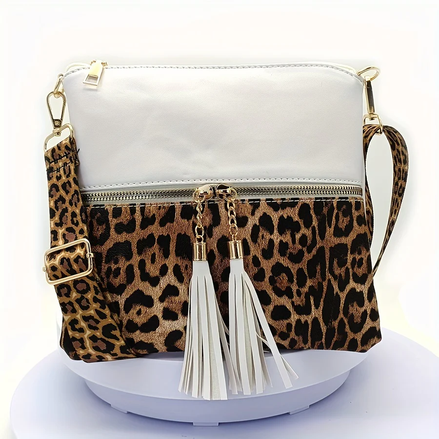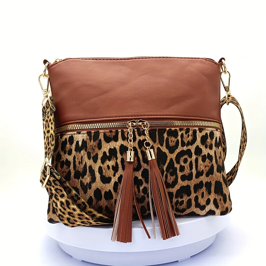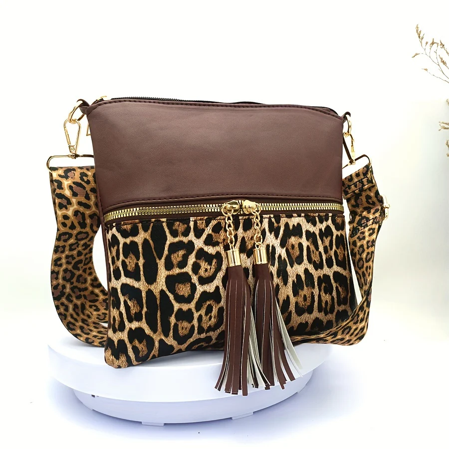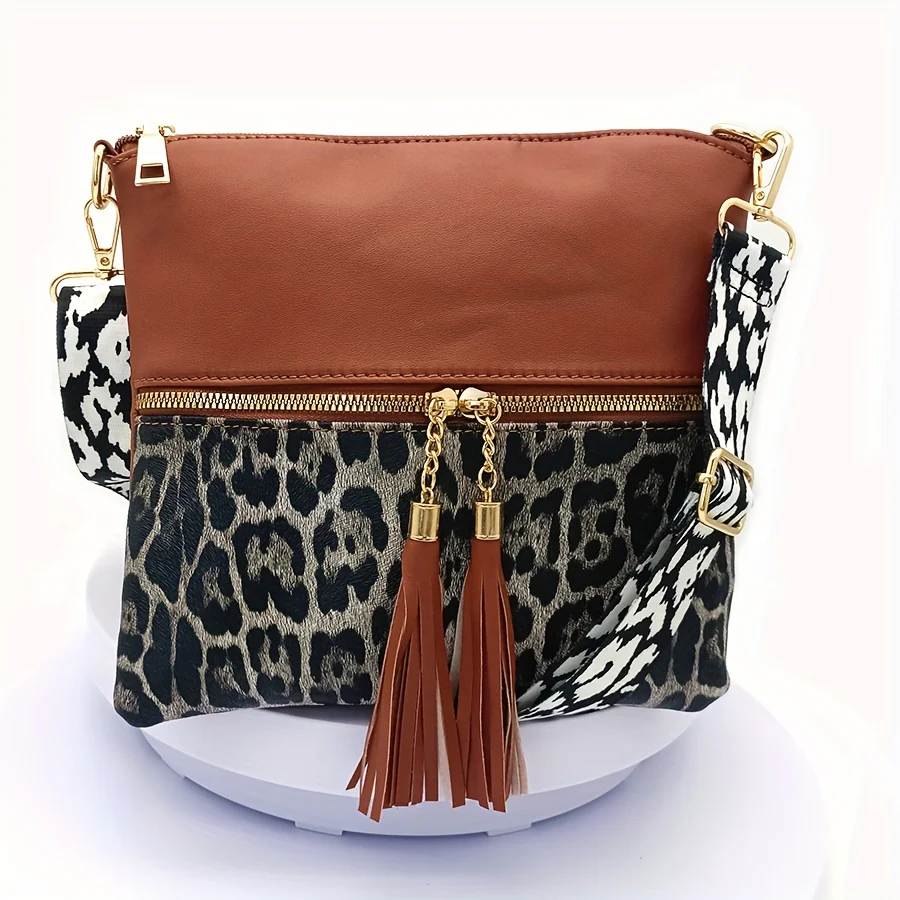 Stylish Leopard Print Tassel PU Crossbody Pouches - Adjustable Removable Strap, Zipper Closure, Polyester Lining, Random Animal Print Design - Fashionable Womens Handbags for Everyday Use