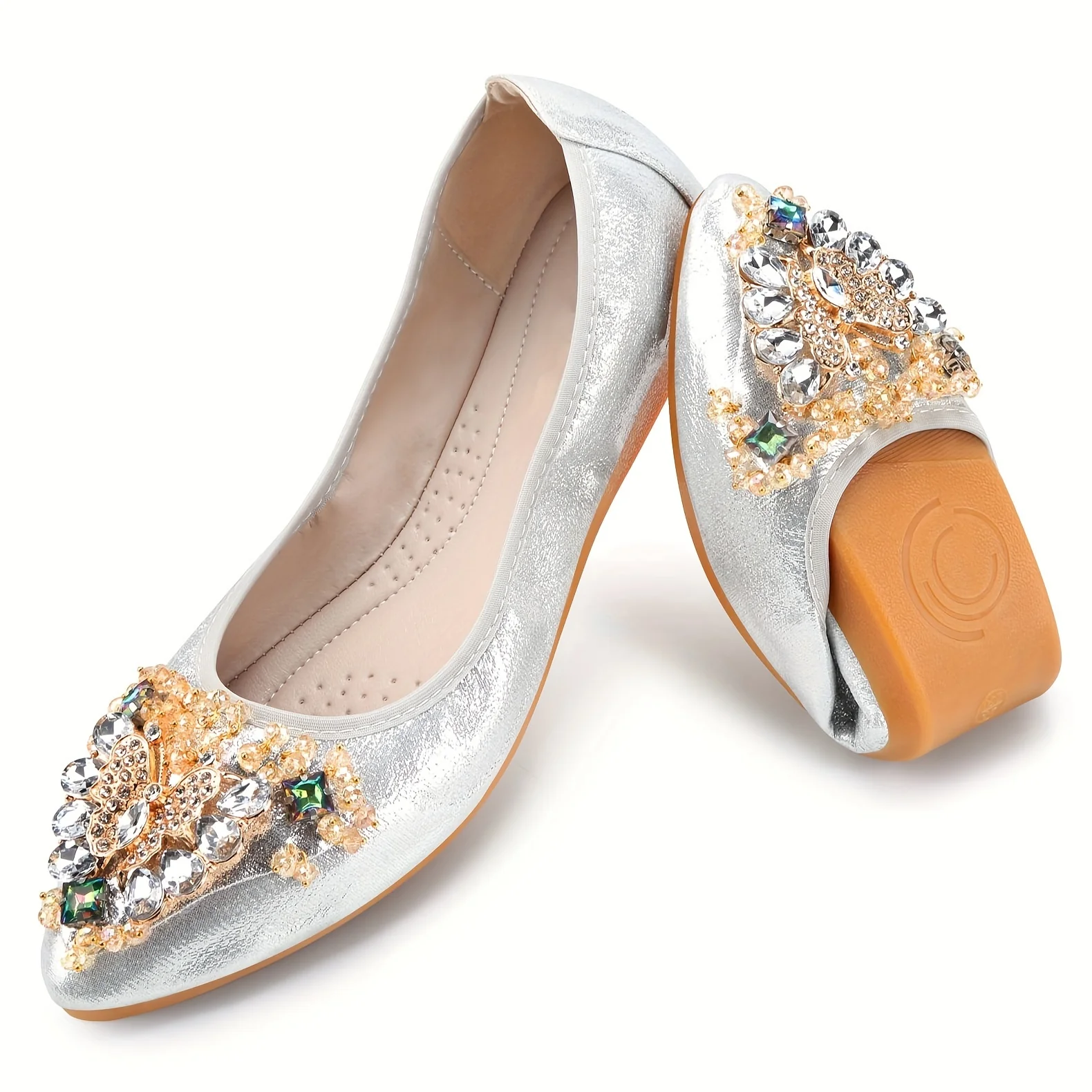 KUNWFNIX Sparkling Pointed-Toe Ballet Flats - Rhinestone Embellished, Foldable Soft TPR Sole, Microfiber Artificial Leather Upper, Sequin Decorated, Slip-On Design for Comfortable Walking - Perfect for Summer and All-Season Wear