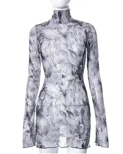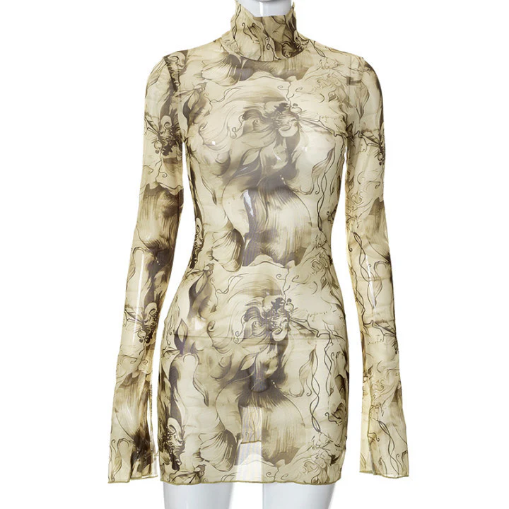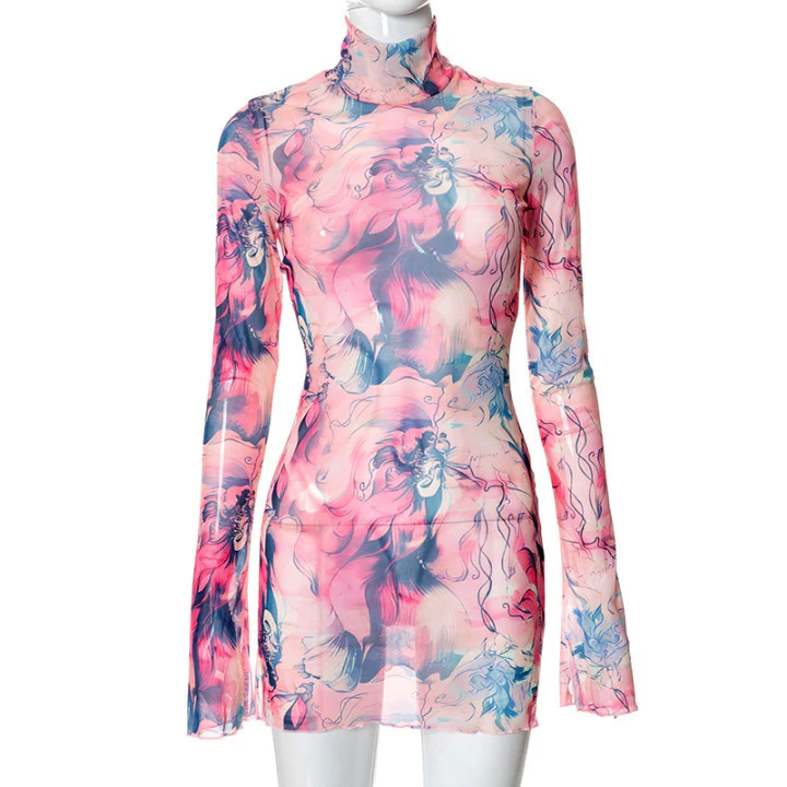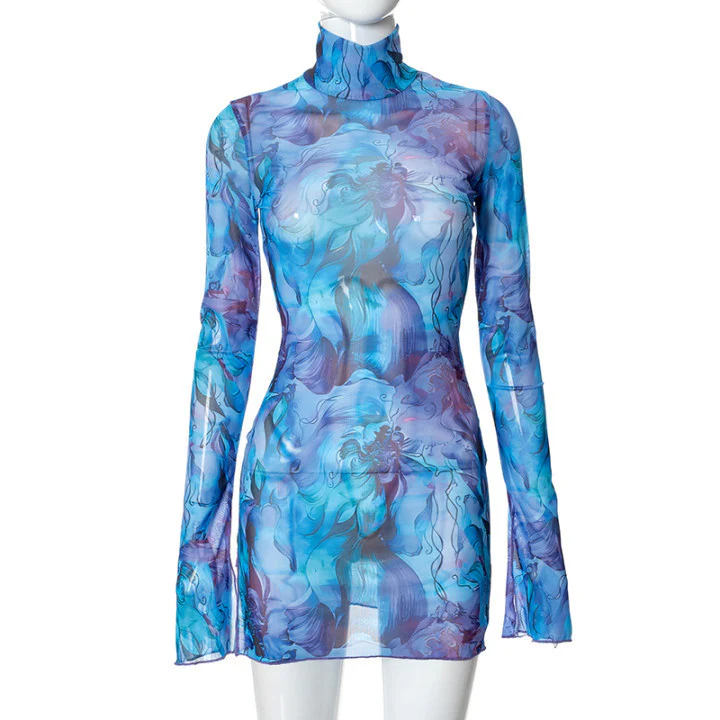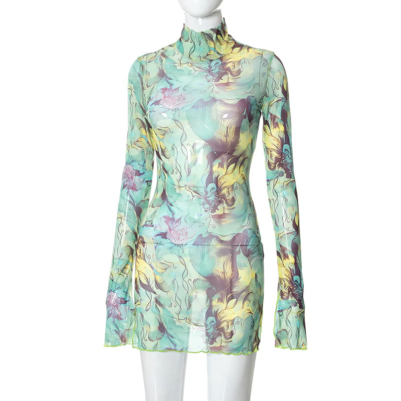 2023 Mesh Floral Print round-Neck Flared Sleeves Side Open Sheath Dress European and American Women's Clothing Summer New Wholesale