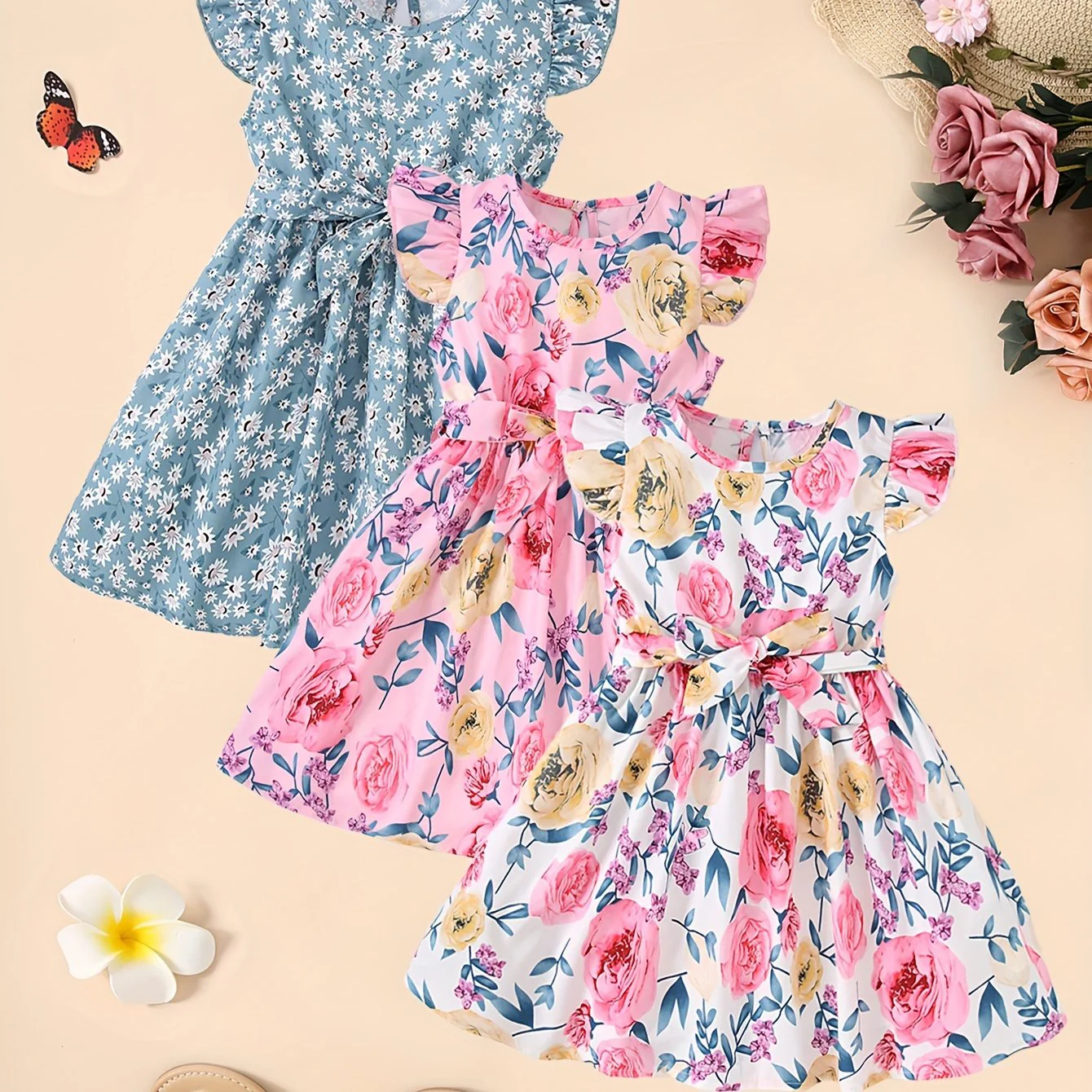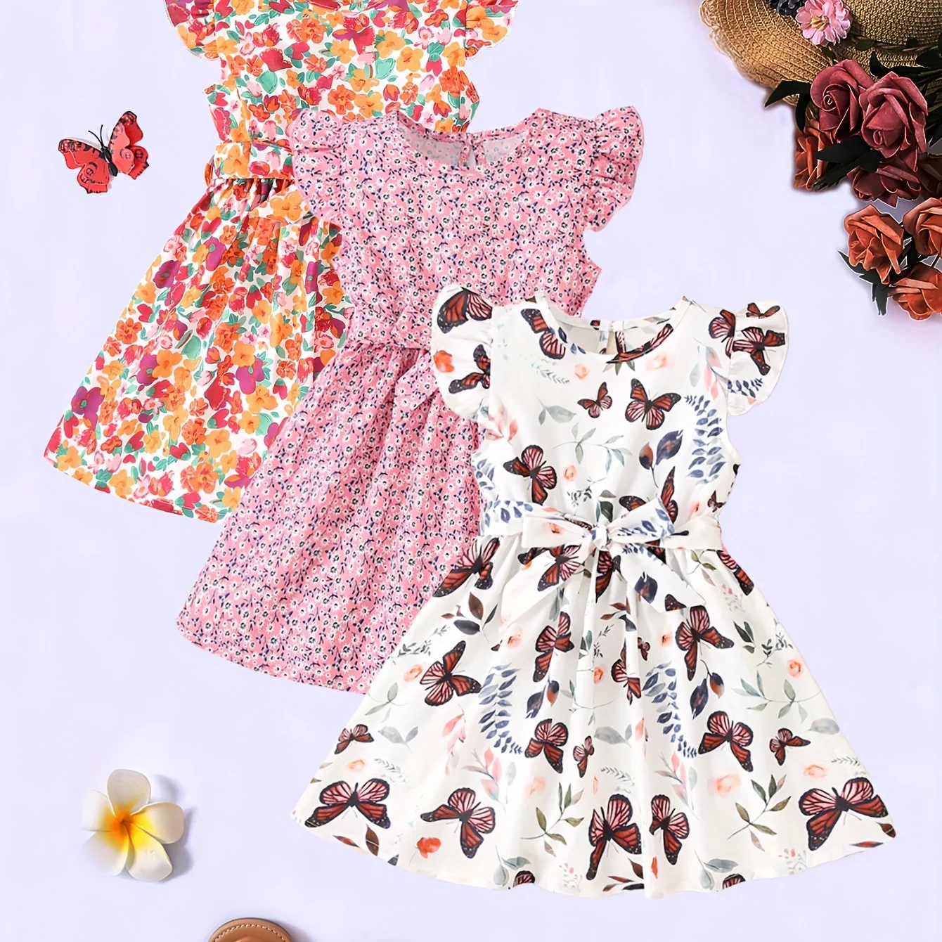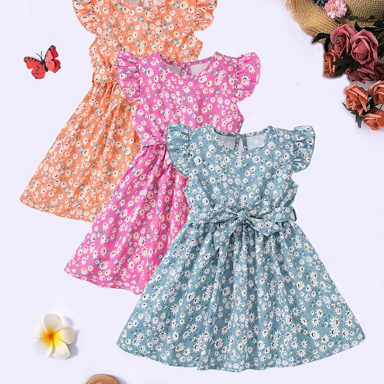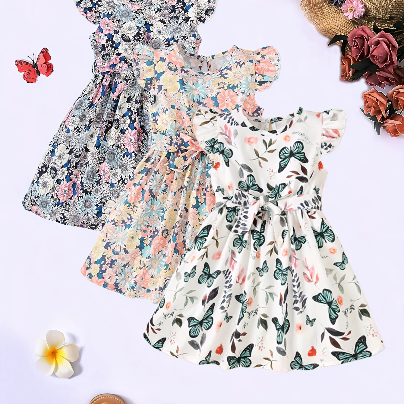 3pcs Little Princess Butterfly Floral Ruffle Trim Dresses - Adorable Belted Casual Summer Dresses for Girls - Polyester Non-Stretch Fabric, A-Line Fit, Perfect for Holiday Gift Party