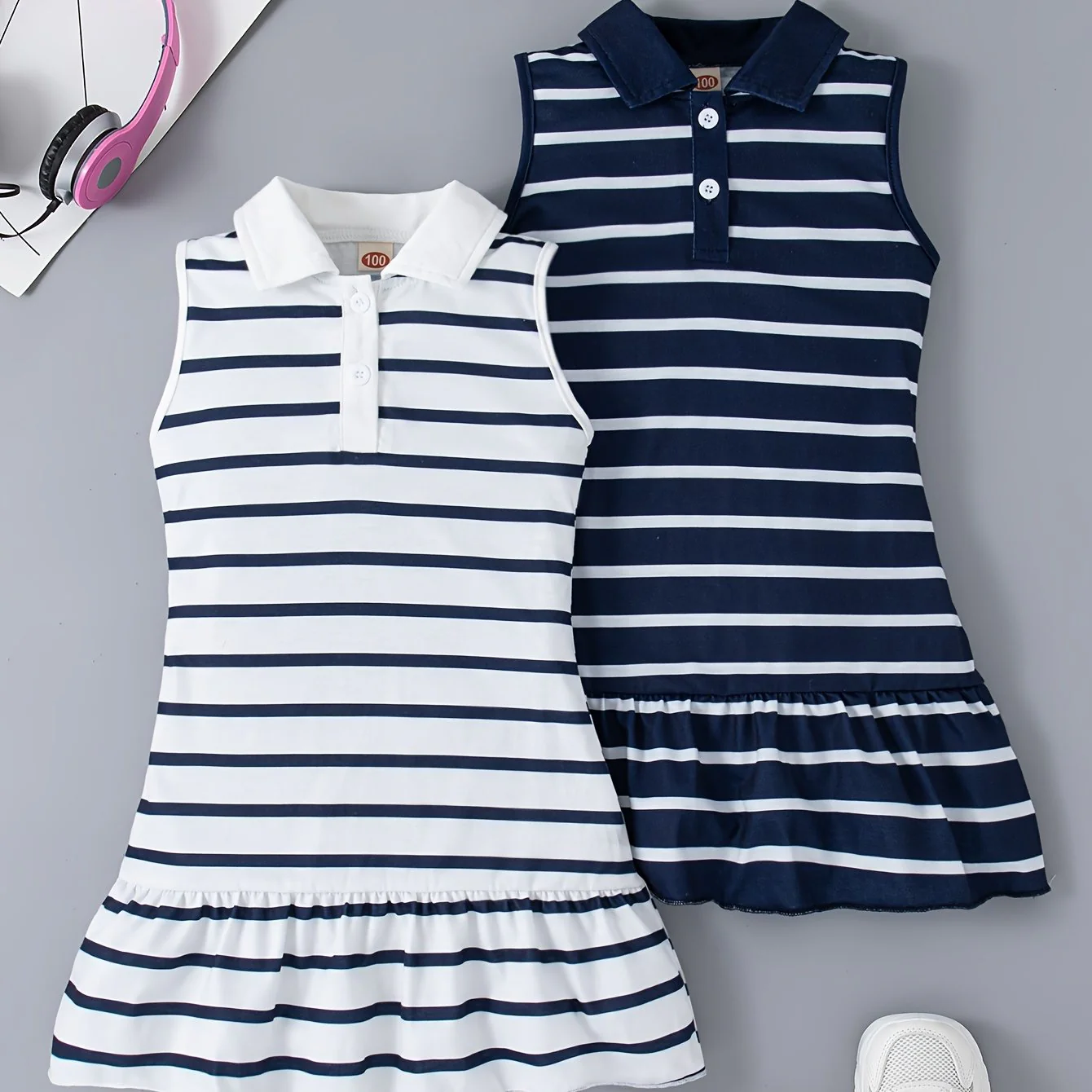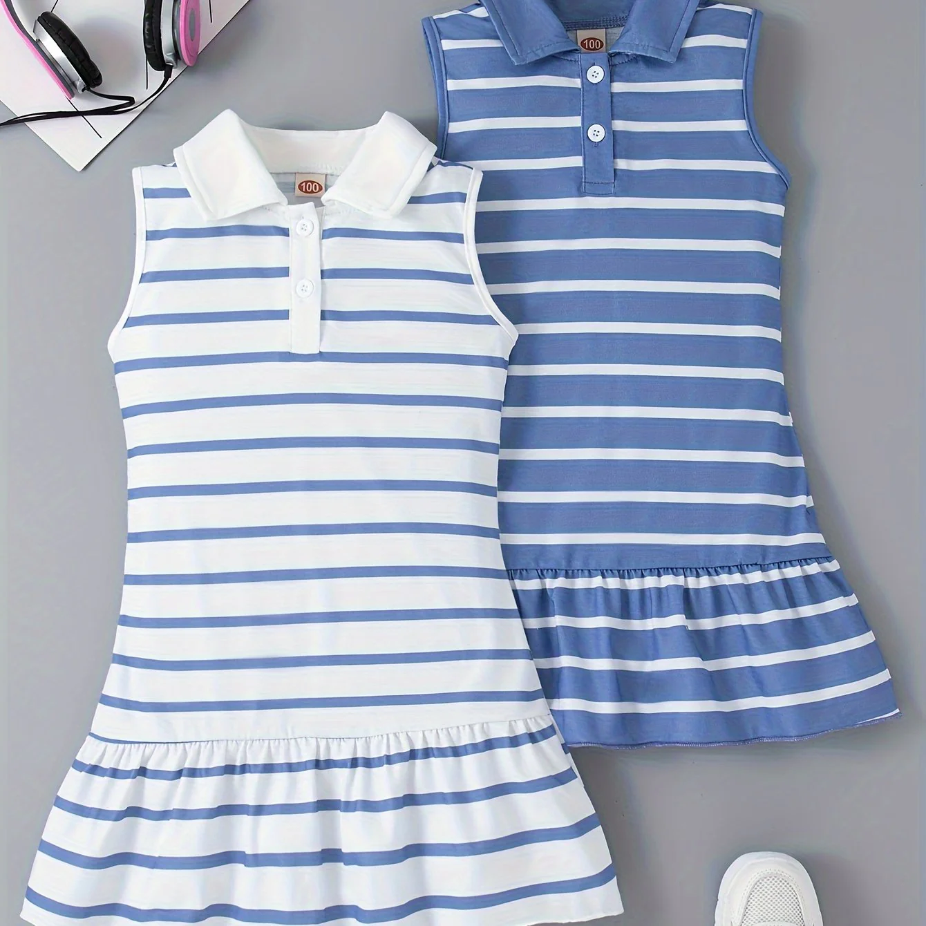 2pcs Adorable Striped Fitted Sleeveless Dress for Girls - Lapel Collar, Knee-High Length, Ruffle Hem, Polyester Material, Loose Silhouette, Perfect for Summer Party and Holiday - Casual and Comfortable