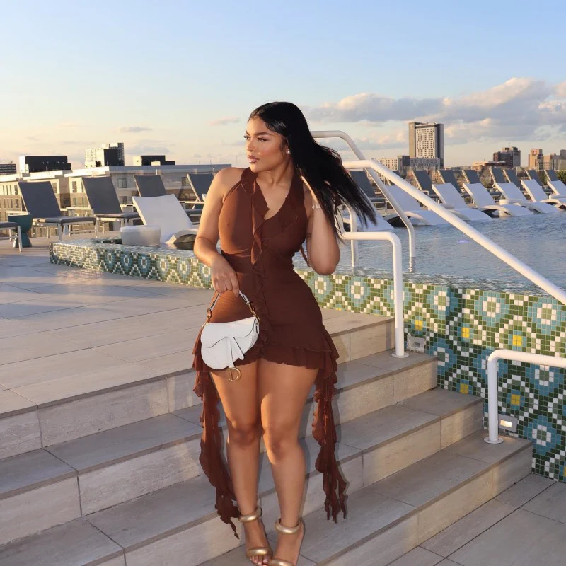 A145ds European and American 2025 Summer New Solid Color Sleeveless Low Collar Wooden Ear Irregular Hip-Wrapped Short Dress