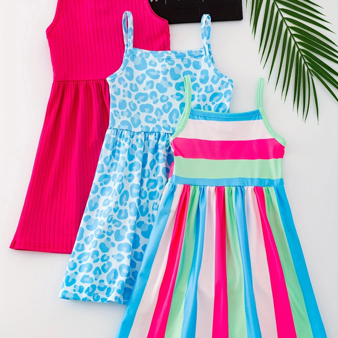3pcs Chic Girls' Cami Dress Set - Leopard & Stripes, Soft Stretch Fabric, Sleeveless Summer Outfits for Holidays & Parties