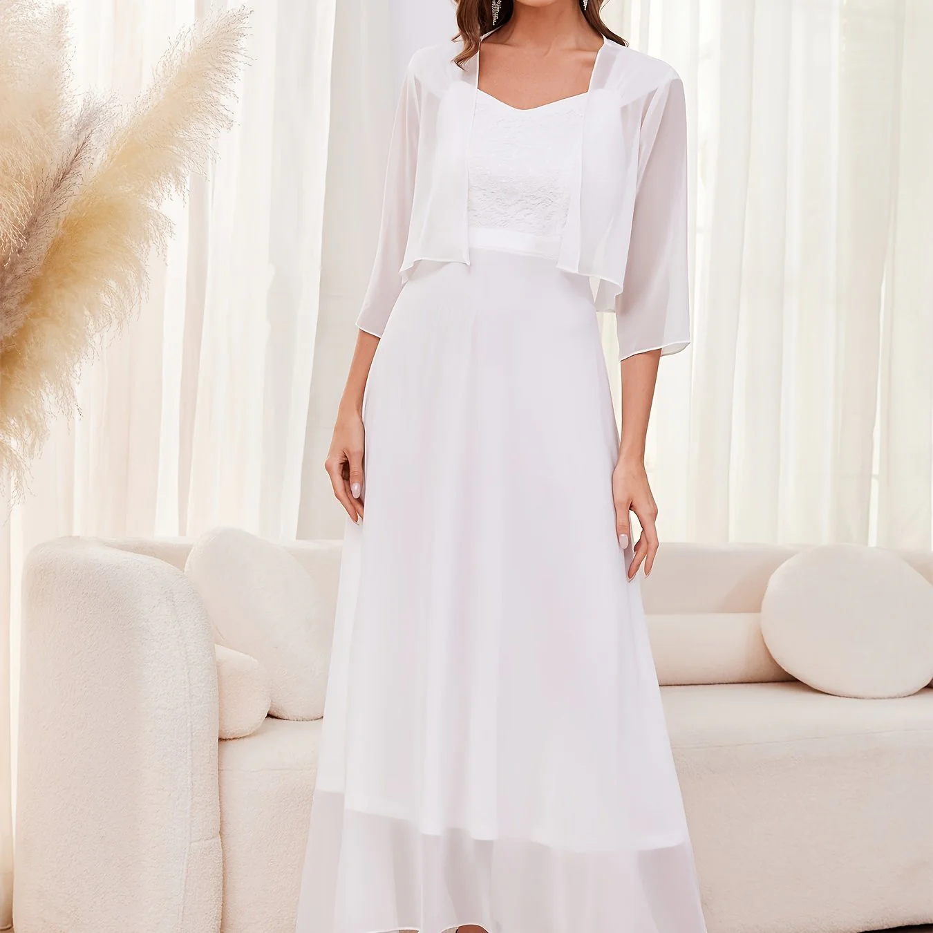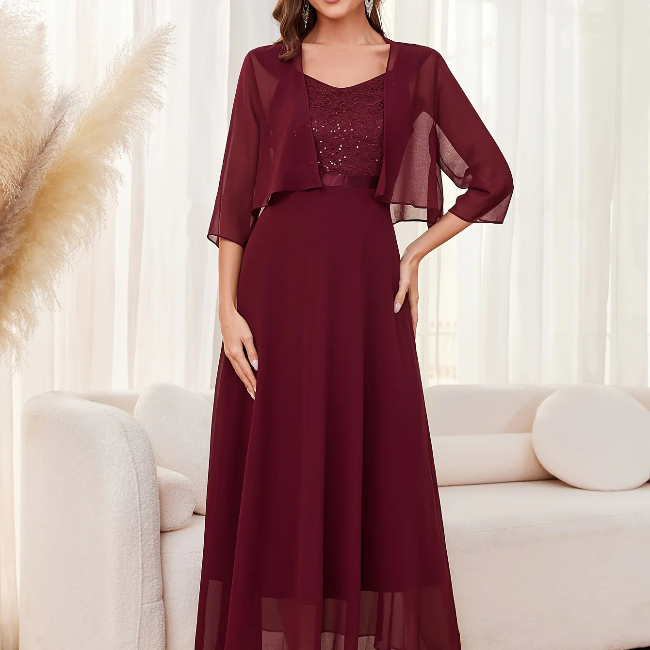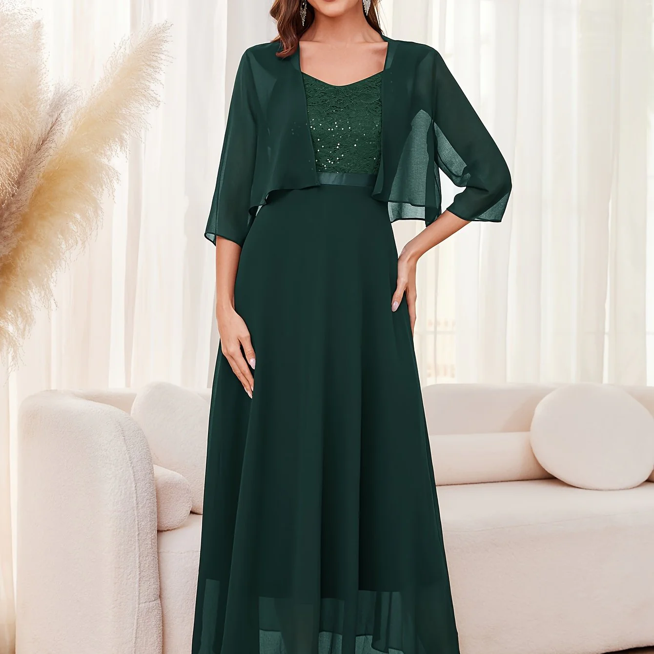 Elegant Pendulum Dress Set - Crew Neck, Micro Elastic Polyester, Solid Color, Open Front Half Sleeve Cover Up & Sequined Lace Splicing Aline Flowy Dress for Women - Hand Wash or Professional Dry Clean, Woven Fabric
