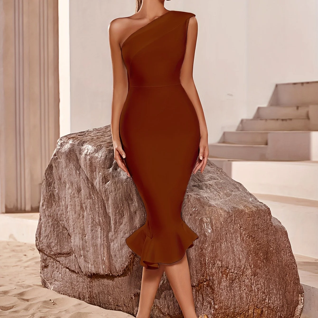 Elegant One Shoulder Bodycon Mermaid Bridesmaid Dress - Asymmetrical Neck, Ruffle Details, High Elasticity, Solid Color, Polyester Knit Fabric - Perfect for Wedding Party, Womens Clothing