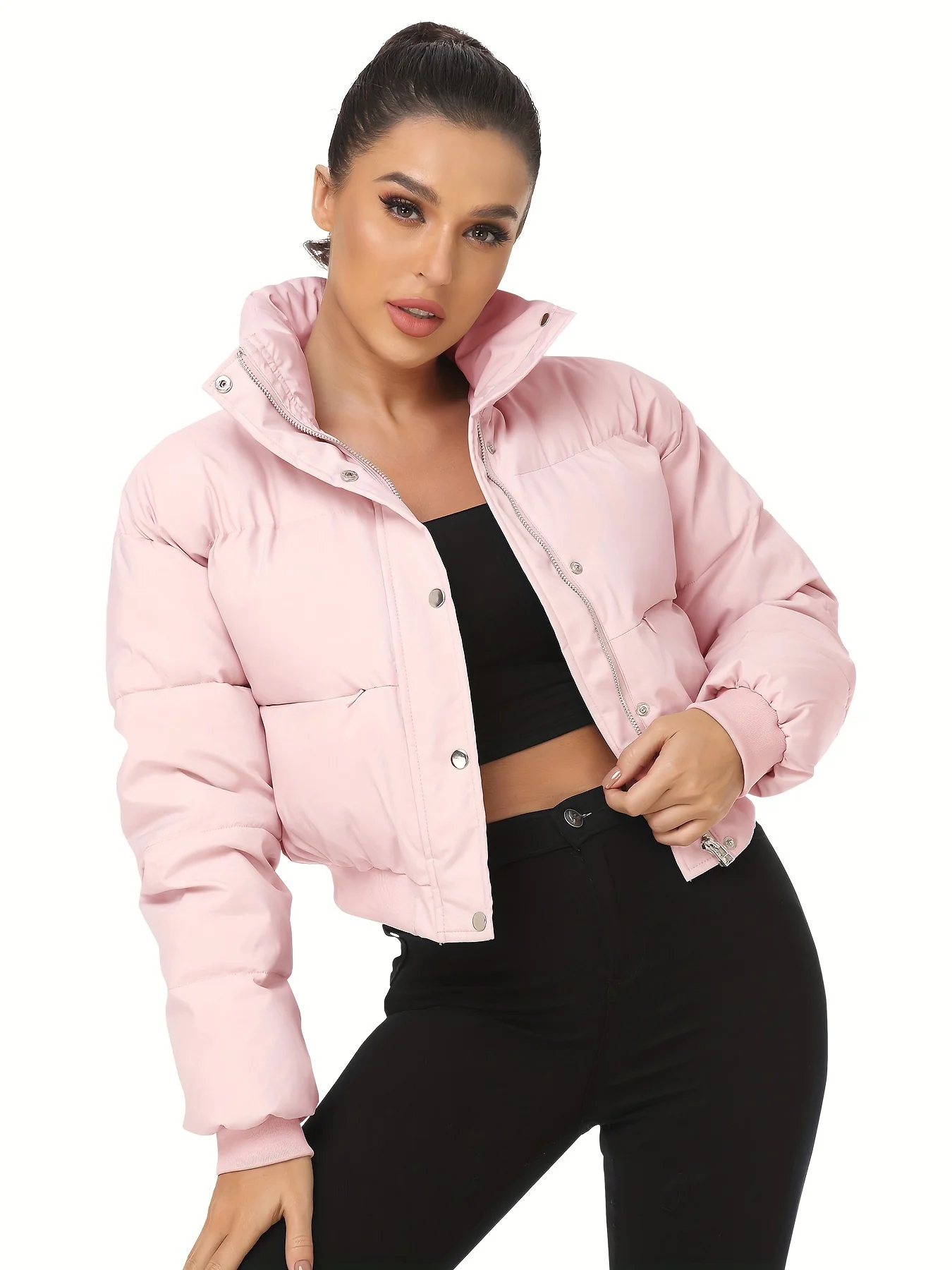 Button Front Cropped Puffer Coat, Casual Stand Collar Long Sleeve Warm Winter Outerwear, Women's Clothing