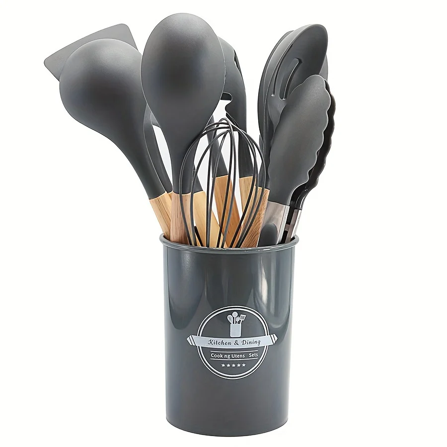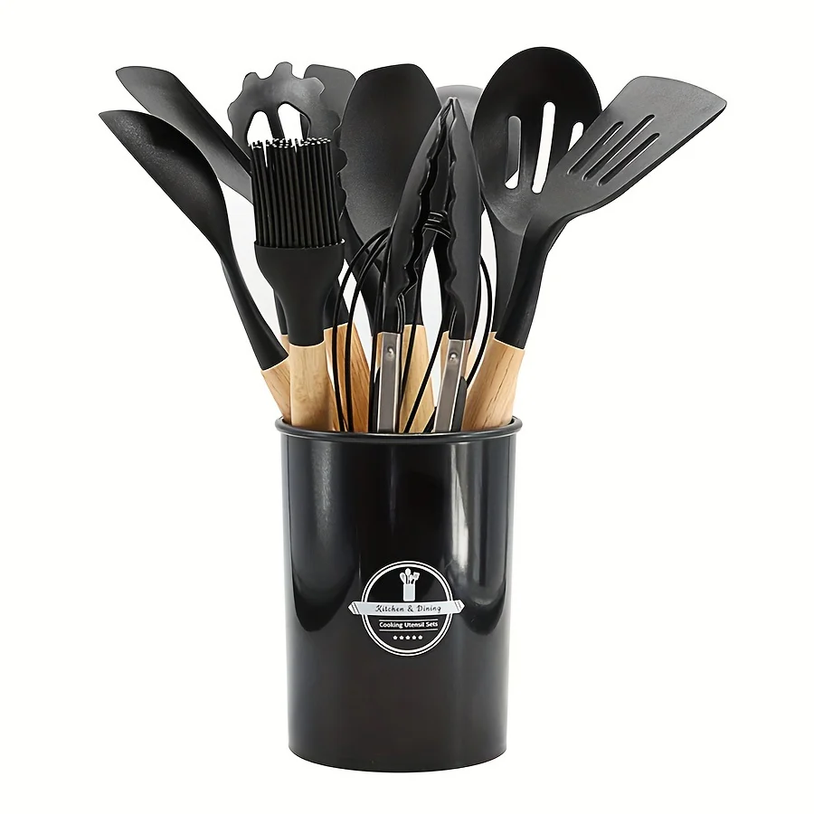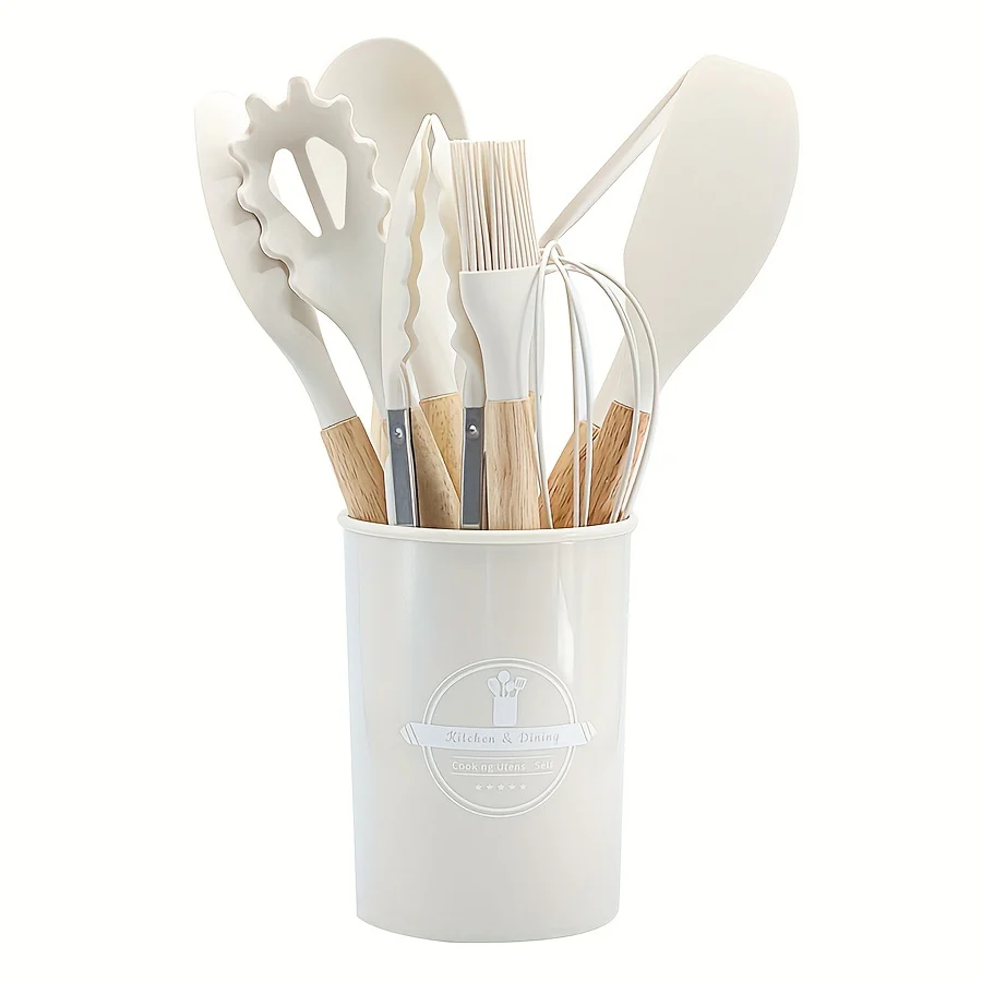 11/12pcs Deluxe Kitchenware Set - Wooden Handle, Non-Stick Silicone Cooking Pots, Spoons, Shovels, and Storage Bucket - Complete Cooking Essentials for Home and Restaurant Chefs