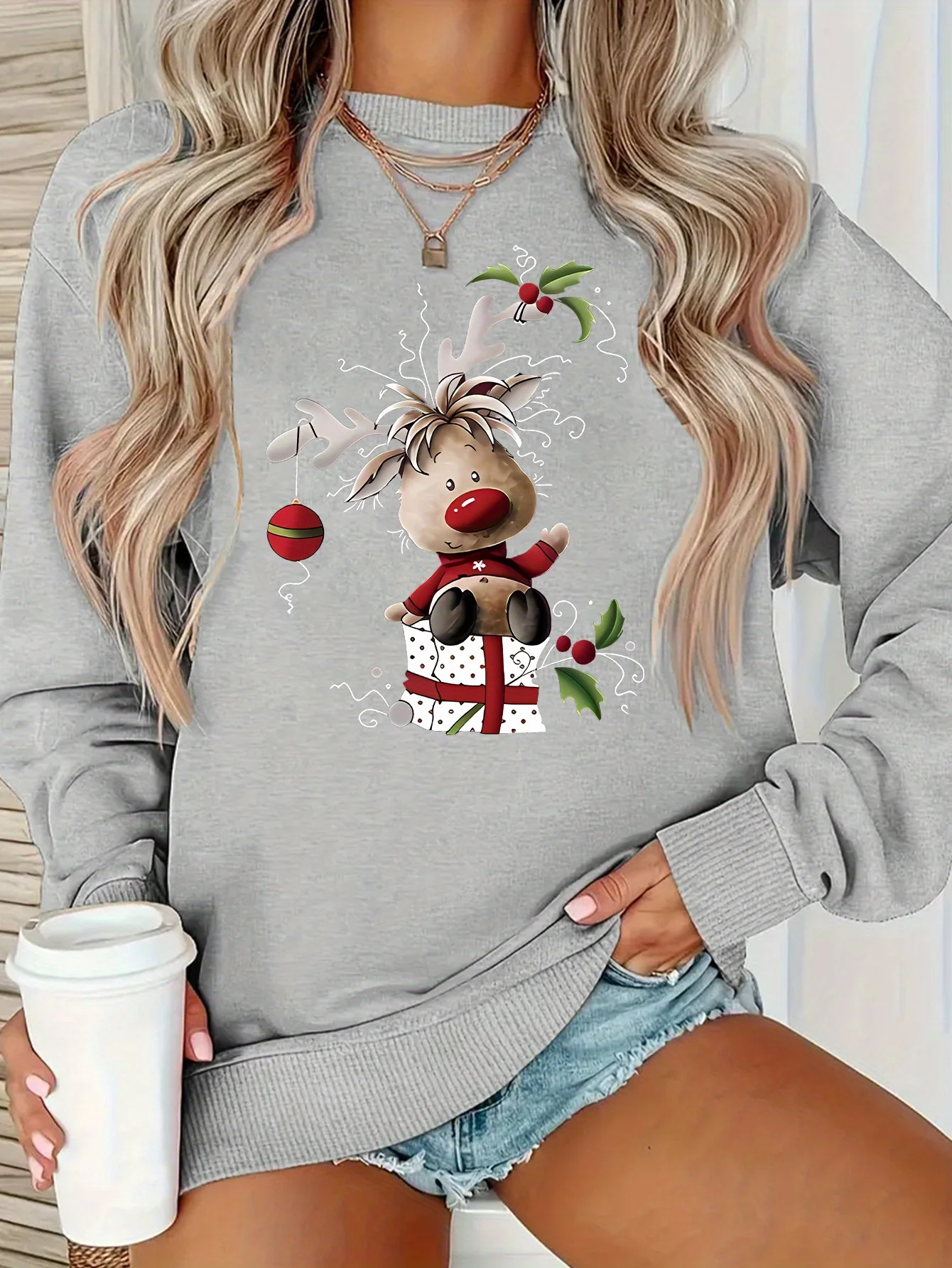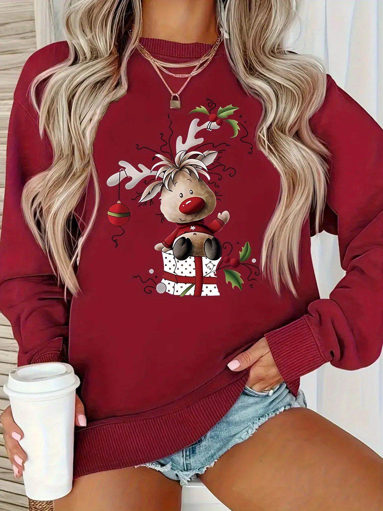 Cozy Deer Pattern Crew Neck Sweater - Women's Elegant Long Sleeve Pullovers for Fall & Winter - Soft, Warm, and Comfortable Clothing for Ladies