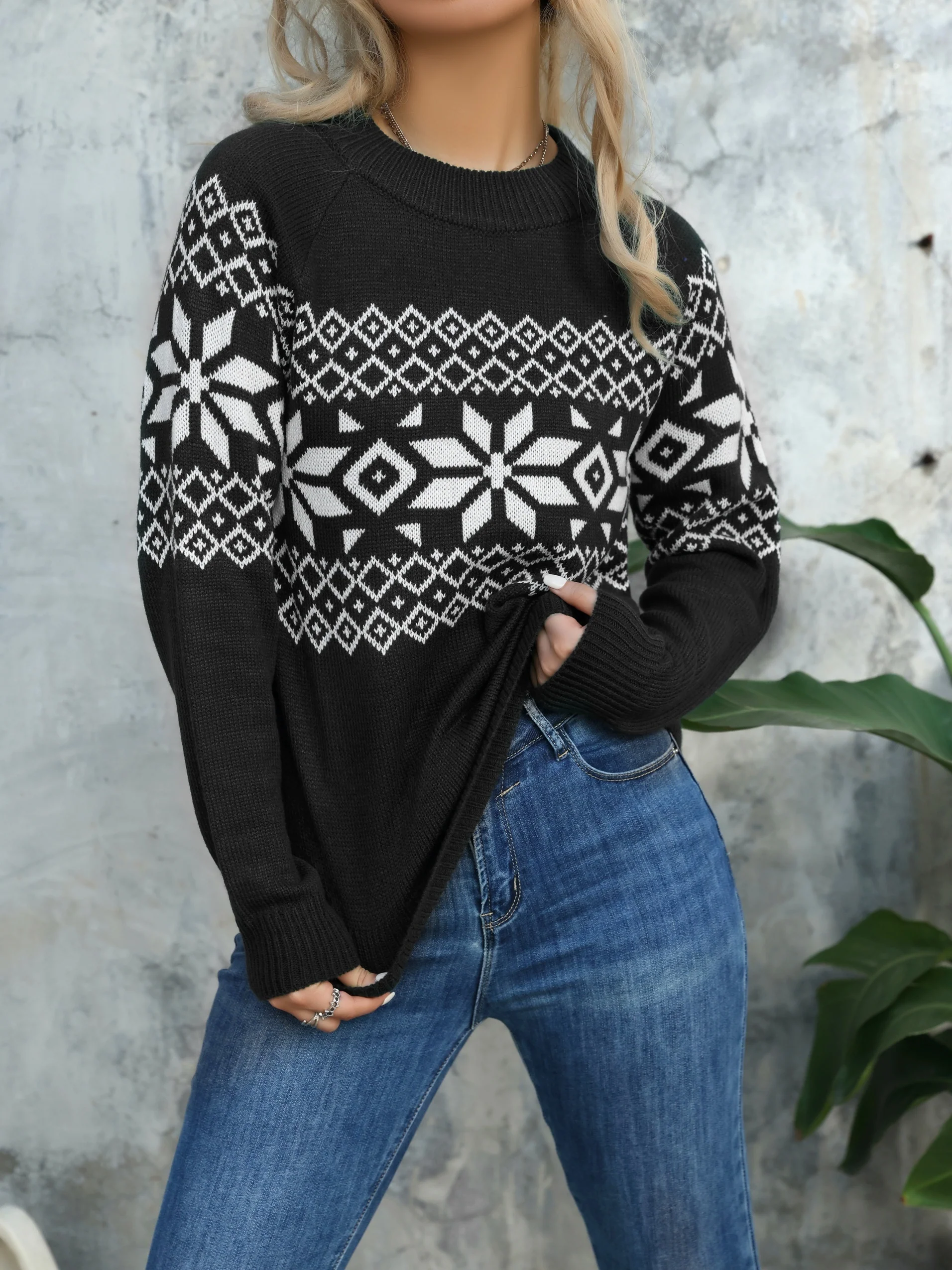 Elegant Geometric Pattern Crew Neck Sweater - Soft, Stretchy, Long Sleeve Knit Top with Raglan Design for Fall and Winter - Perfect for Christmas Parties and Casual Occasions