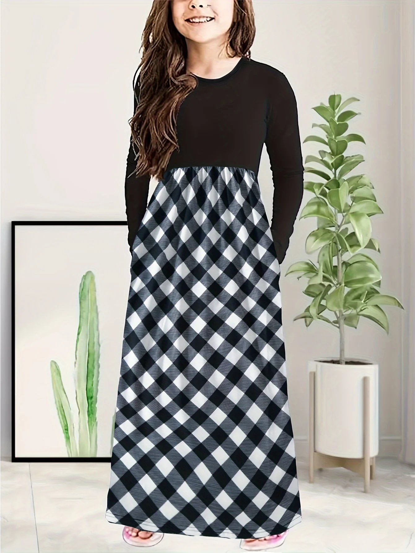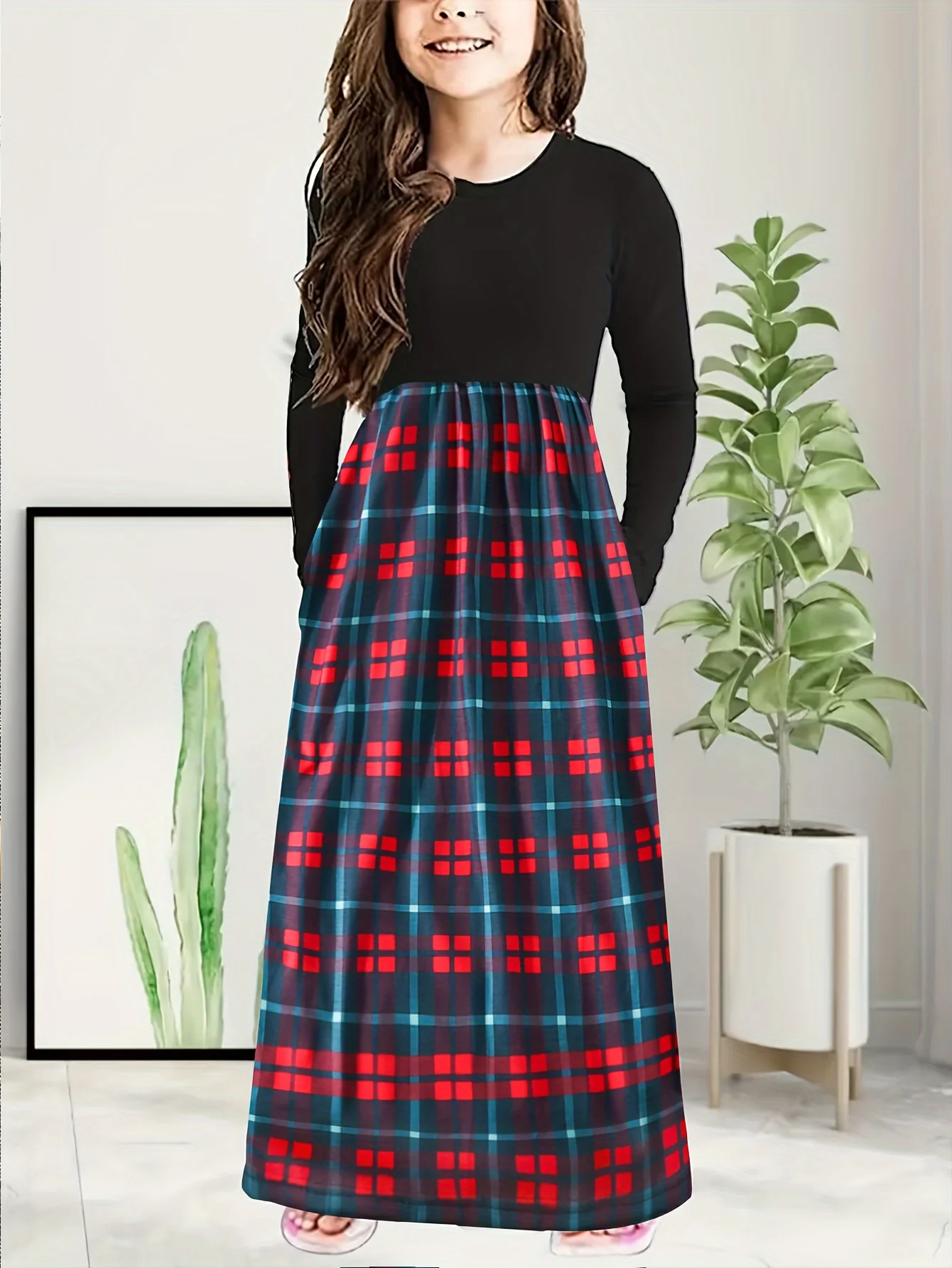 Girls Vibrant Plaid Crew Neck Long Sleeve Dress - Classic Design for Comfort and Warmth - Perfect for Fall and Christmas Parties