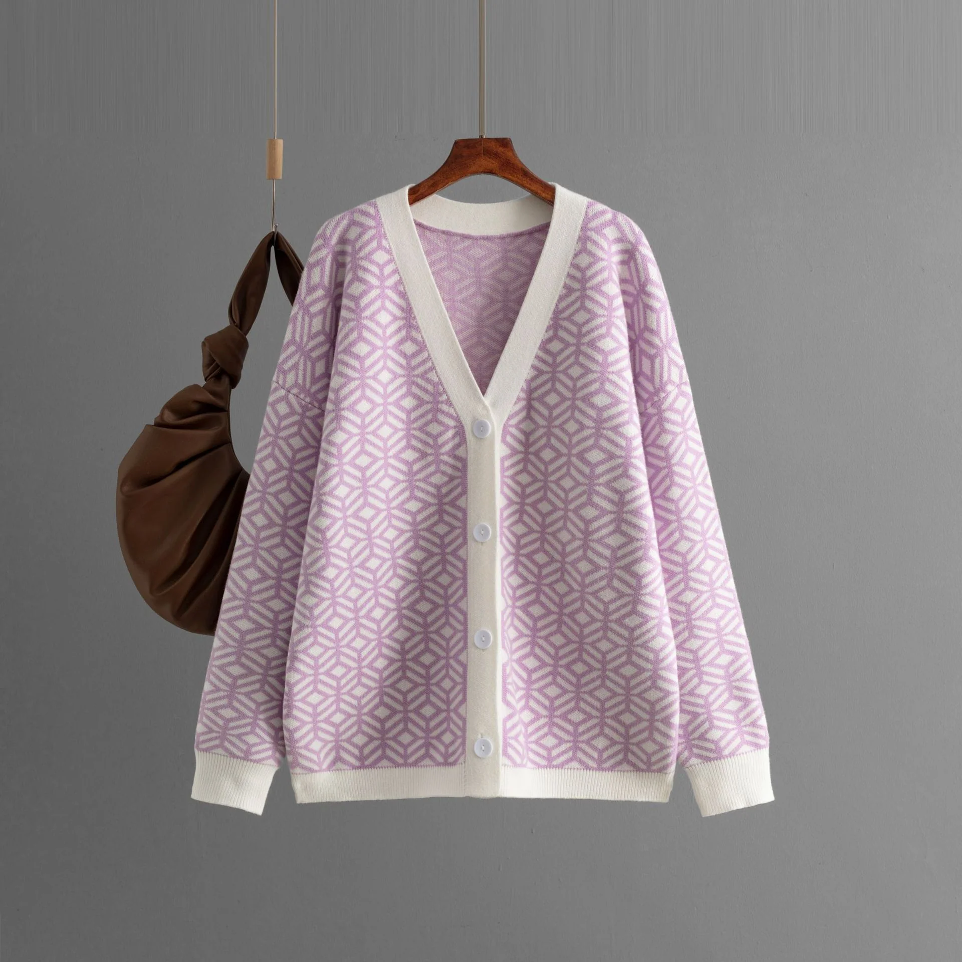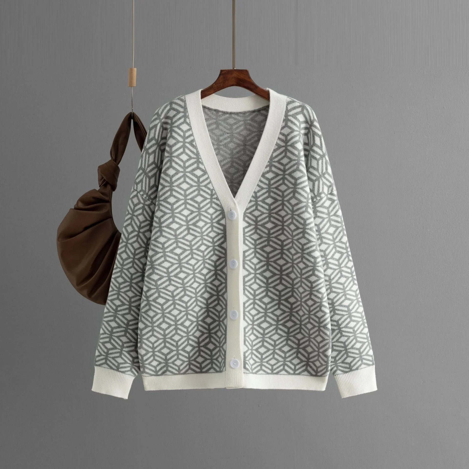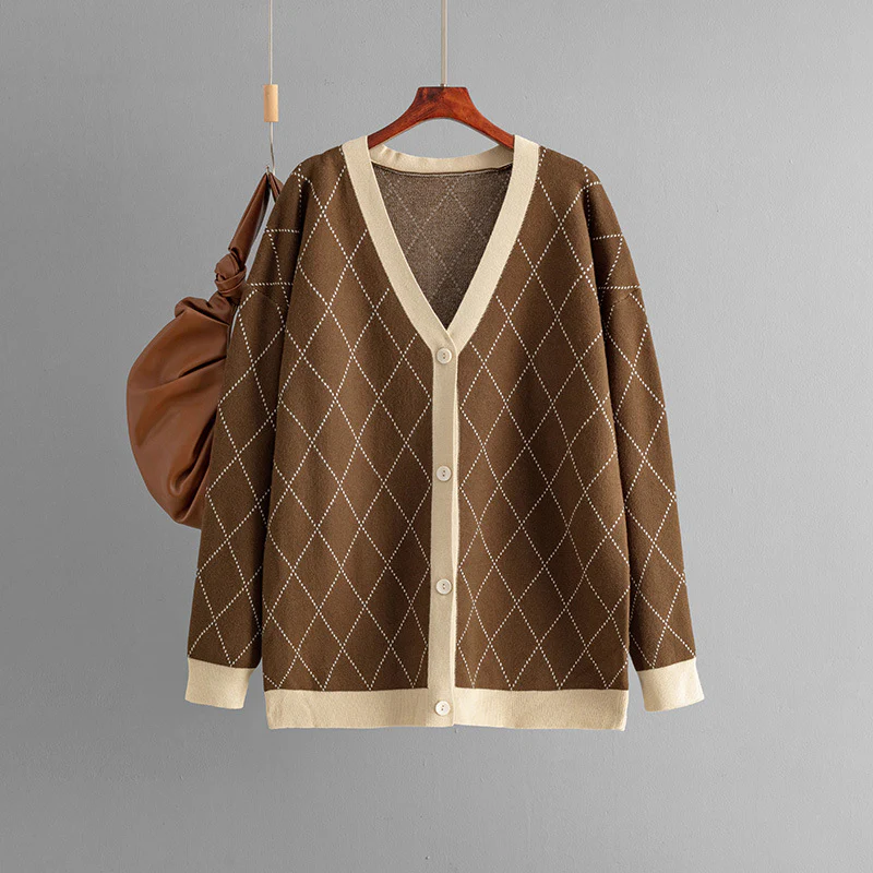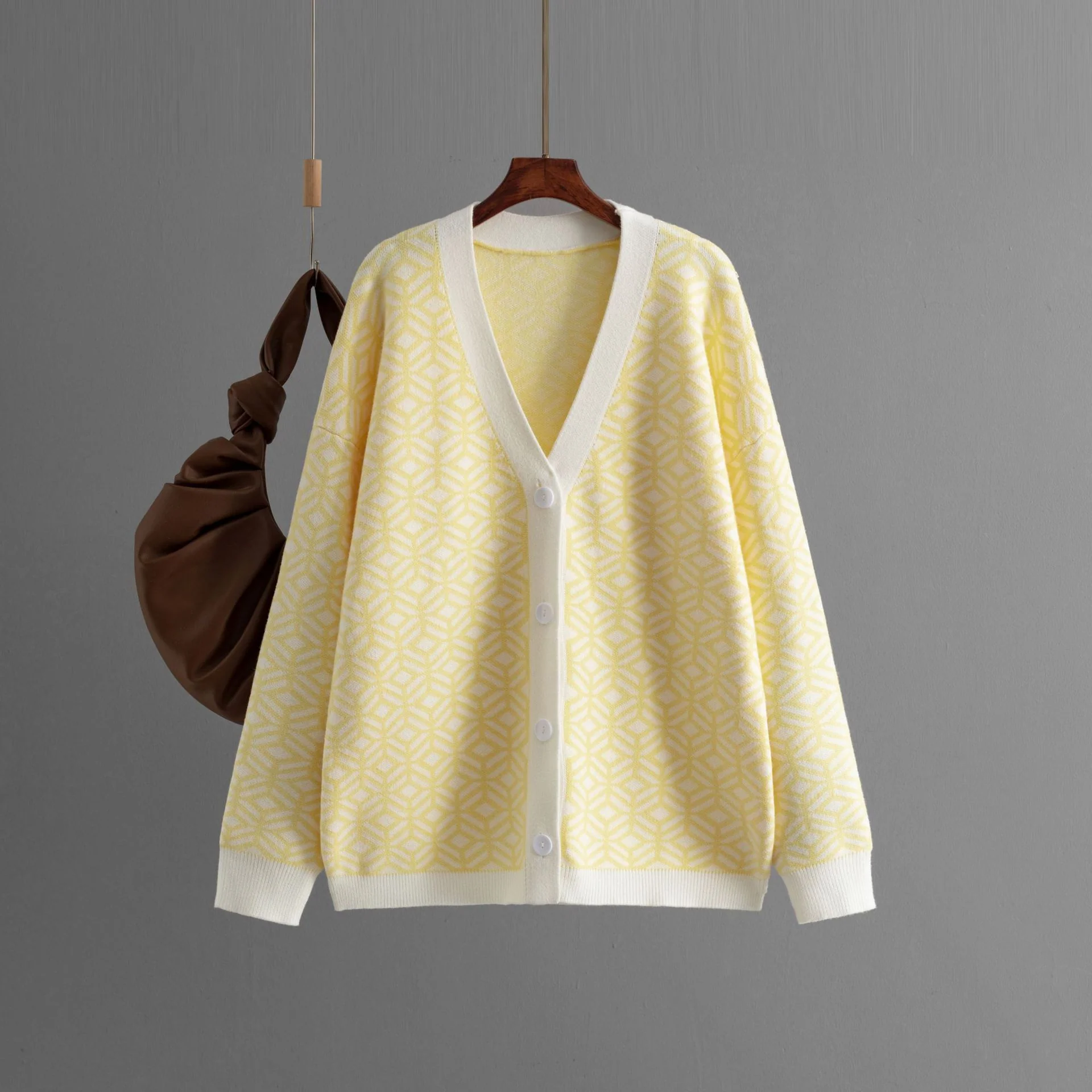DEANWANGKT New autumn and winter new V-neck cardigan sweater cross-border women's clothing casual loose rhombus plaid knitted sweater jacket