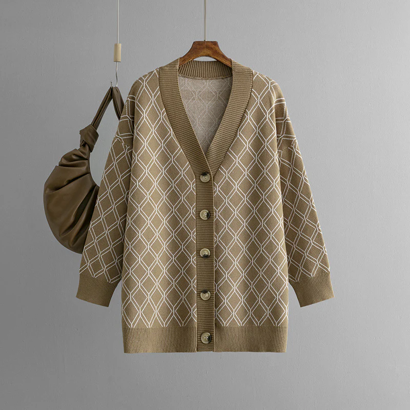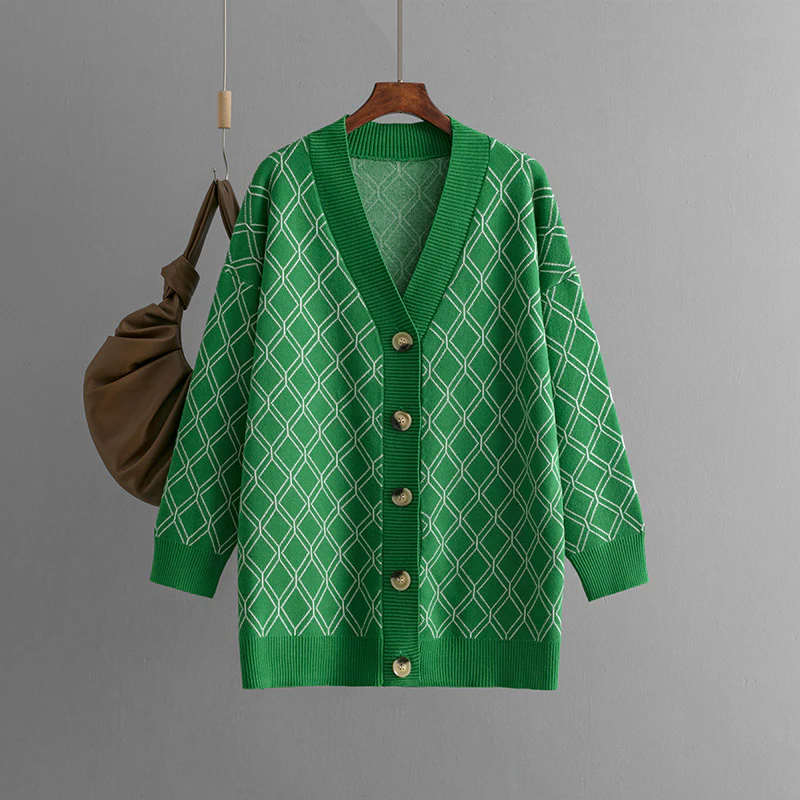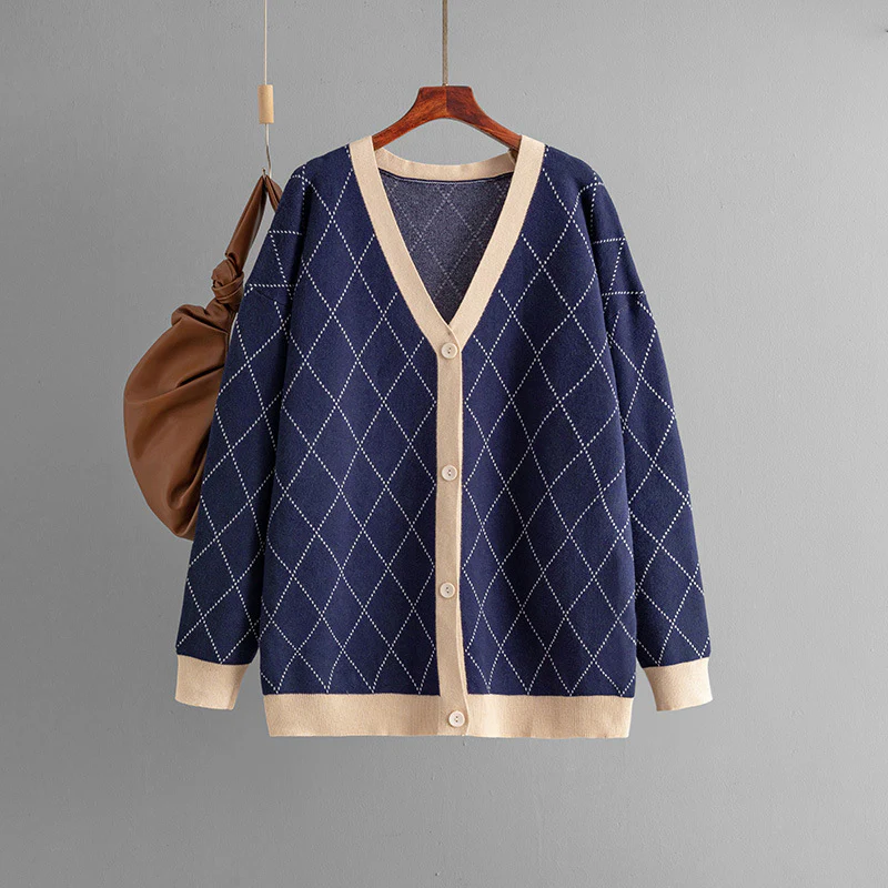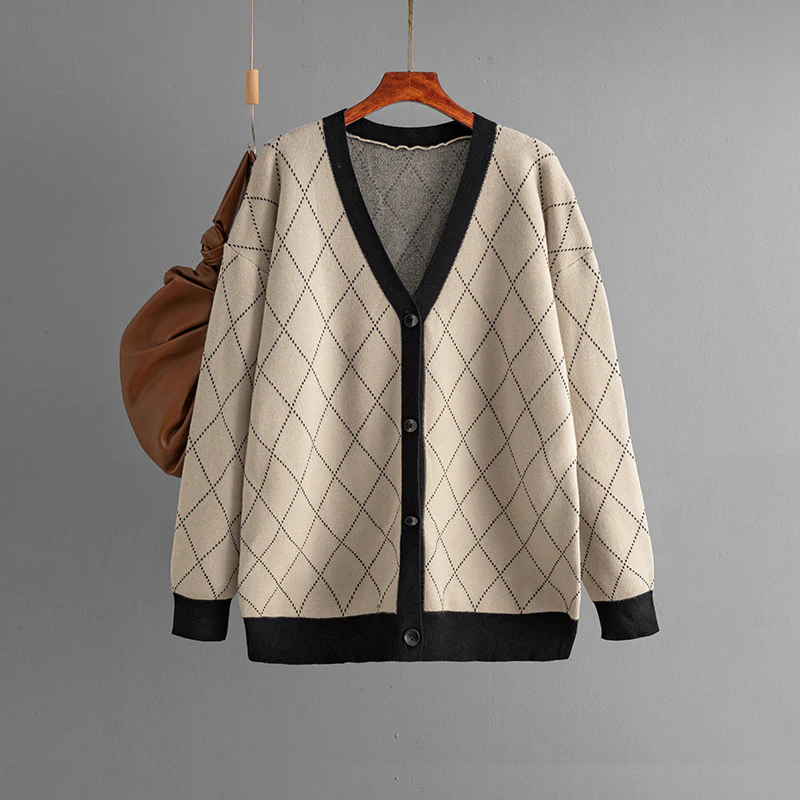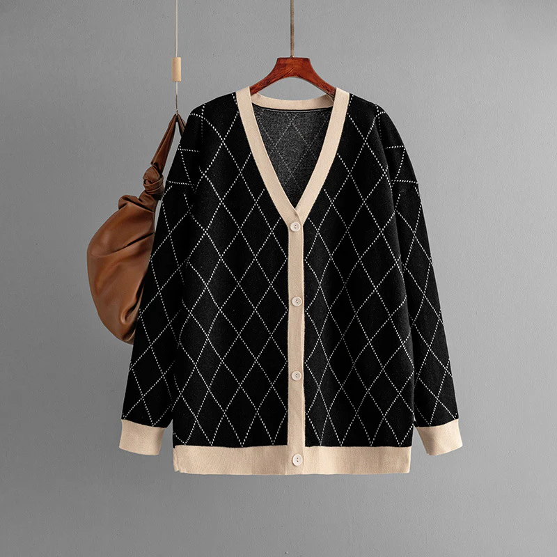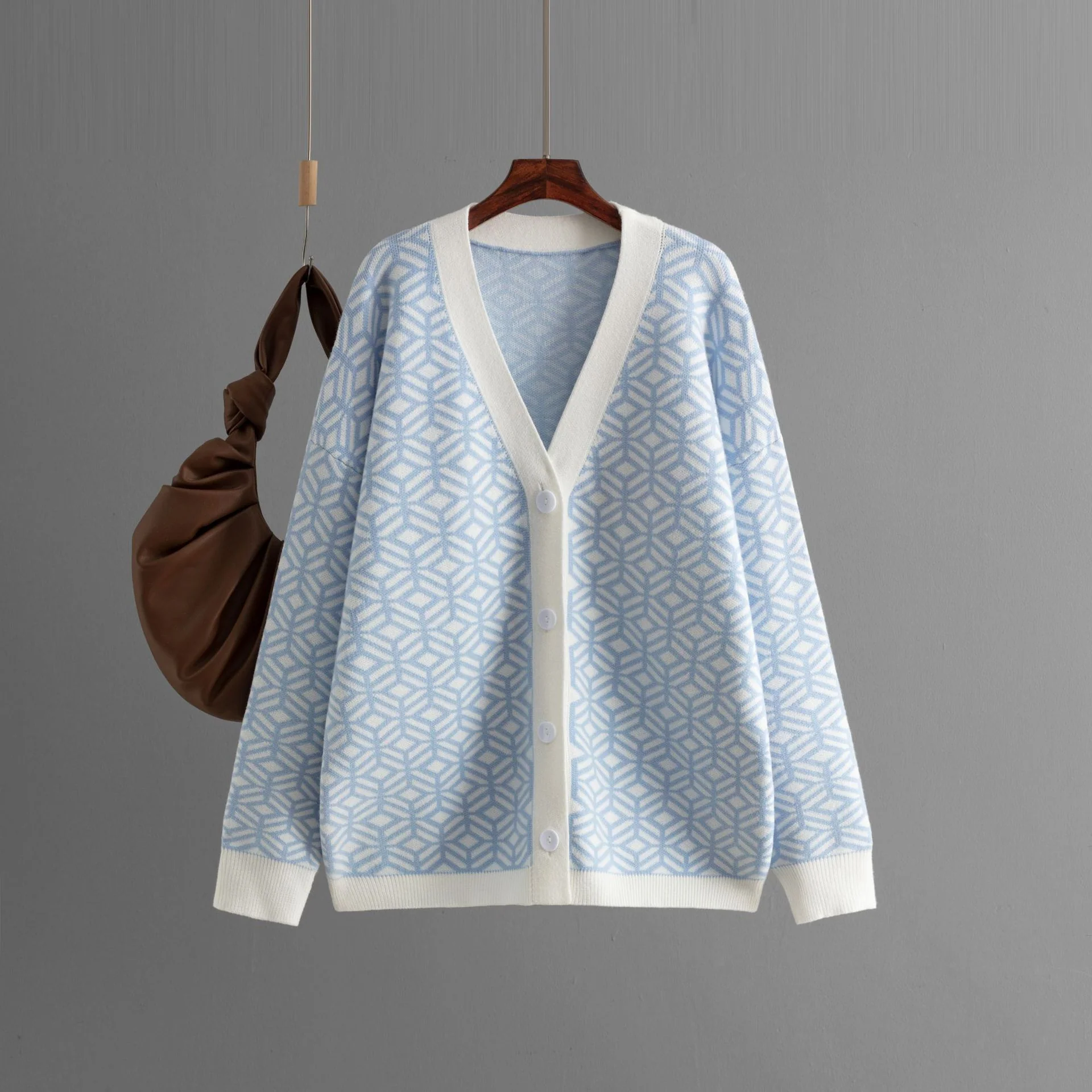DEANWANGKT New autumn and winter new V-neck cardigan sweater cross-border women's clothing casual loose rhombus plaid knitted sweater jacket