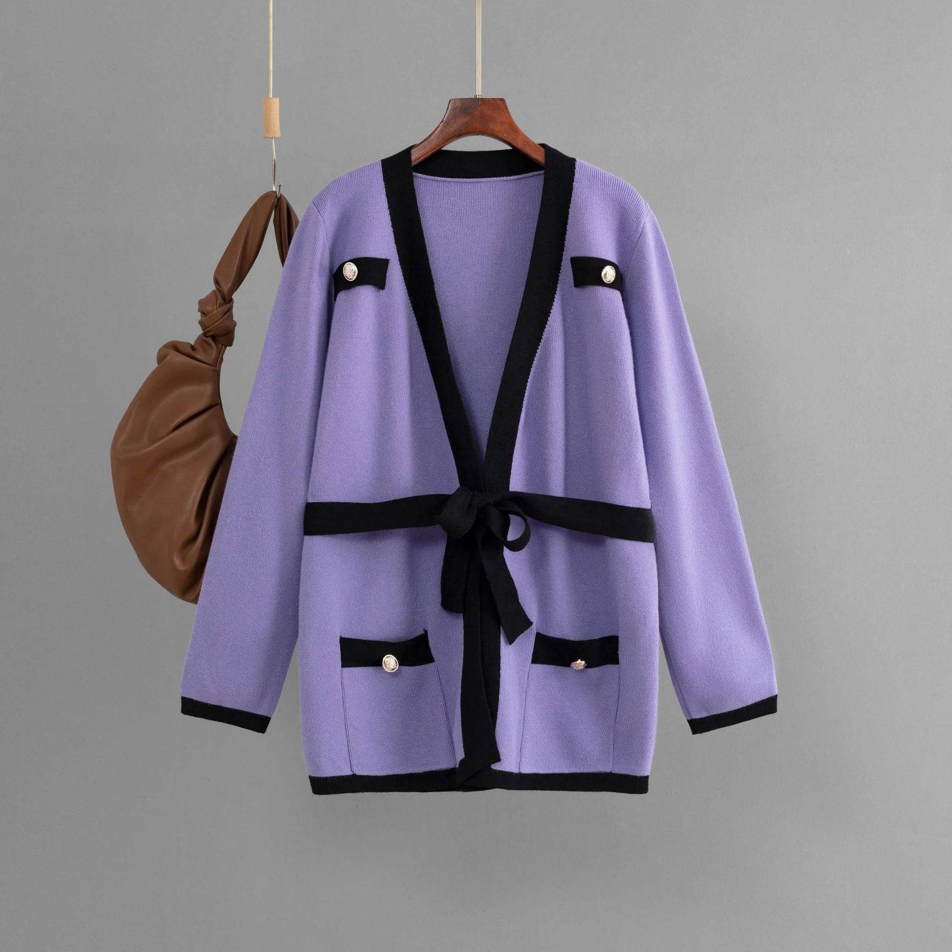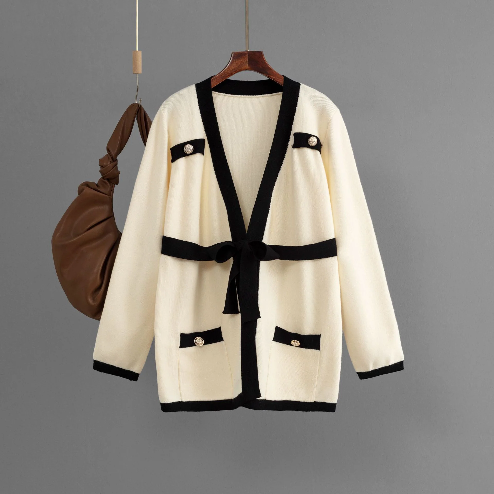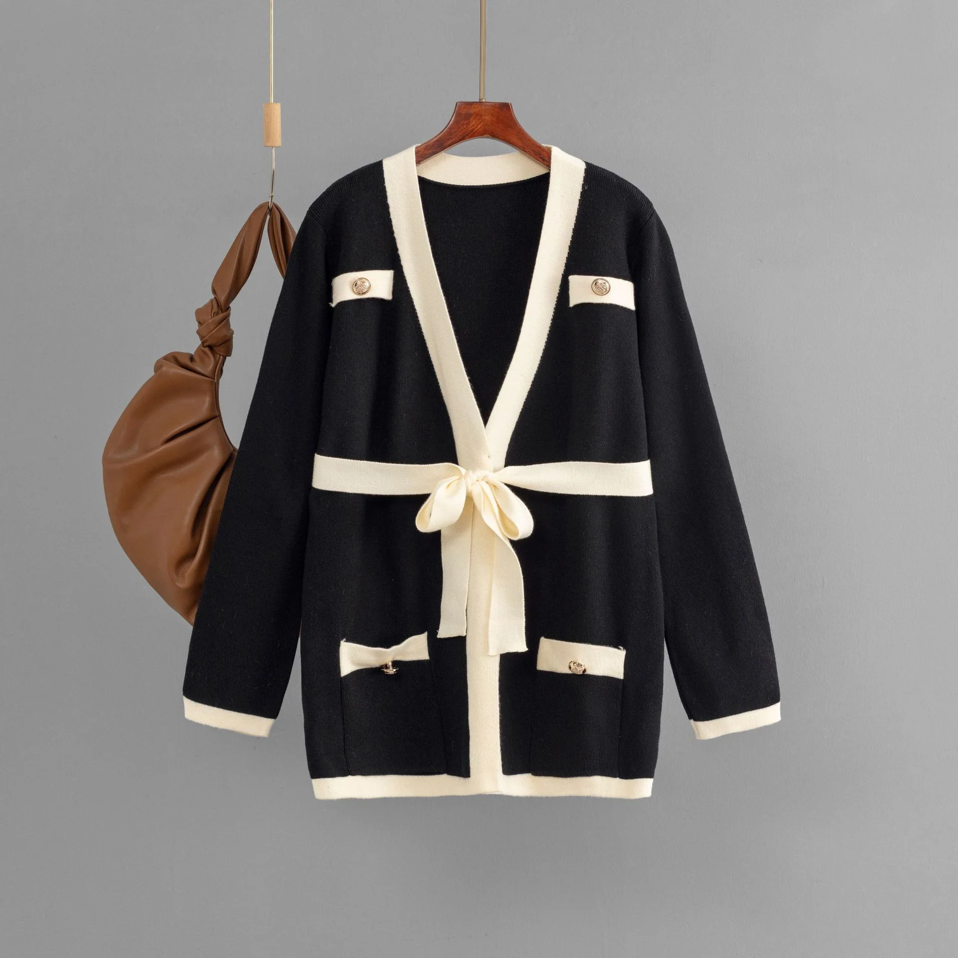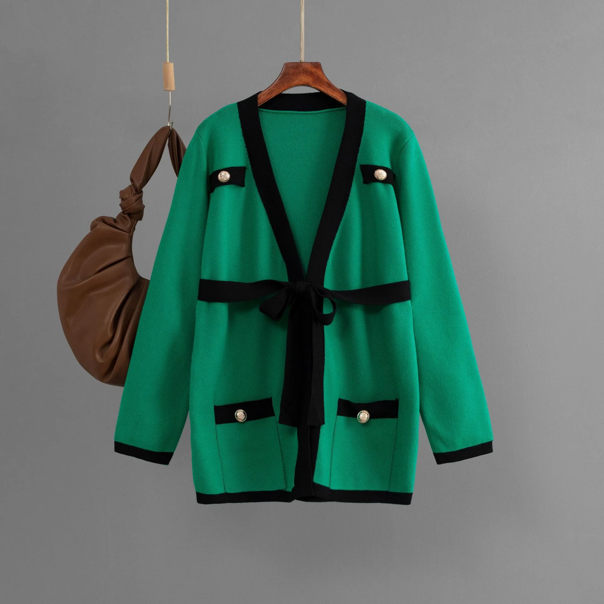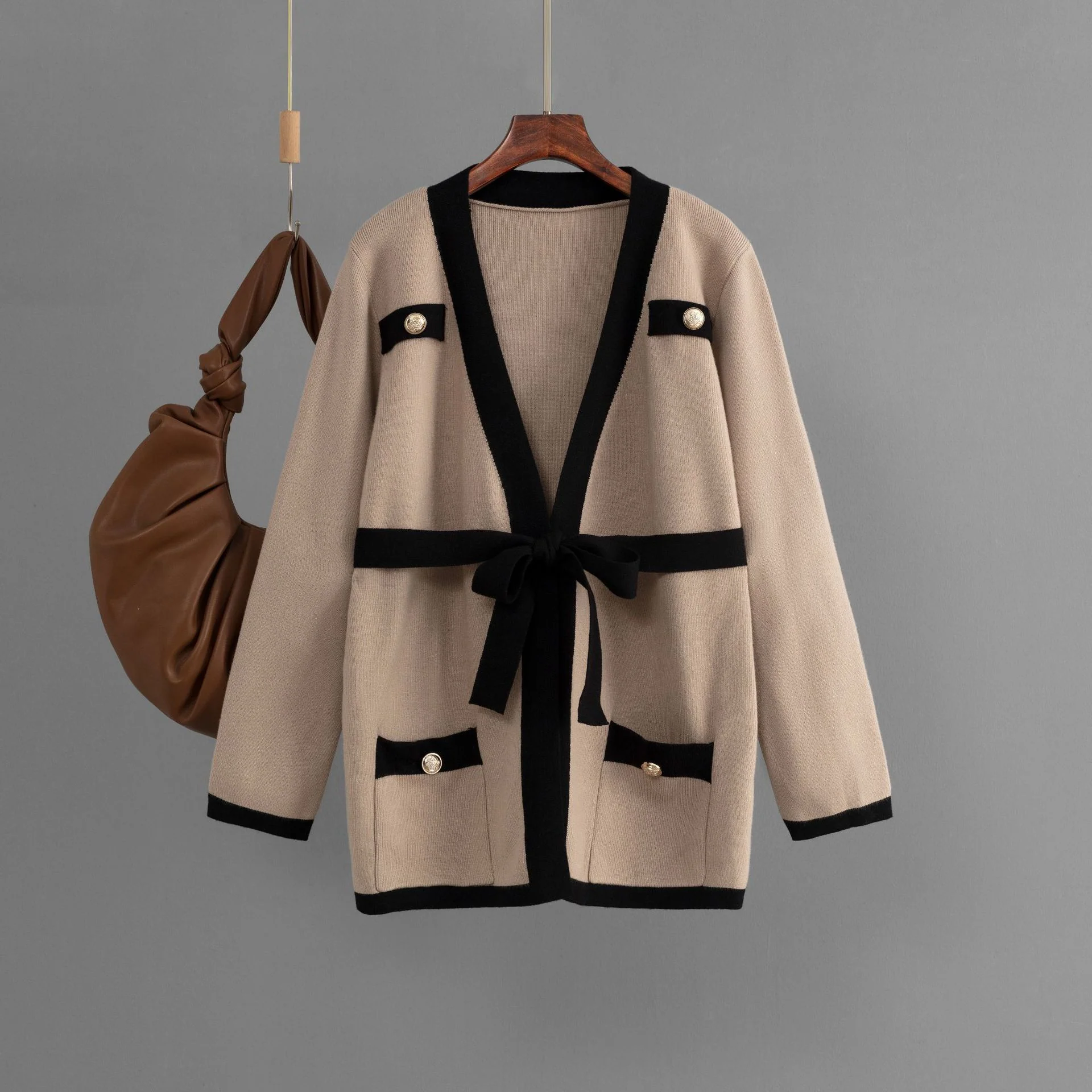 DEANWANGKT New New Women's Sweater Knitted Sweater V-Neck Contrasting Color Lacing Button Large Size Long Sleeve Commuter Fashion Cardigan