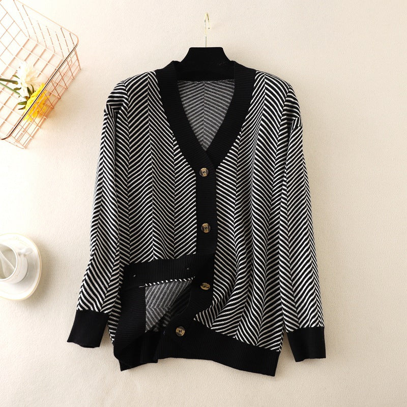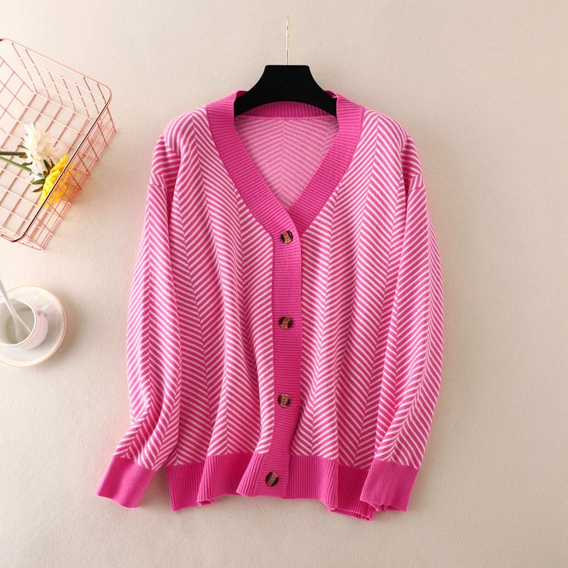 DEANWANGKT spring and autumn new Korean version single-breasted cardigan women's V-neck contrasting loose striped sweater jacket long-sleeved top