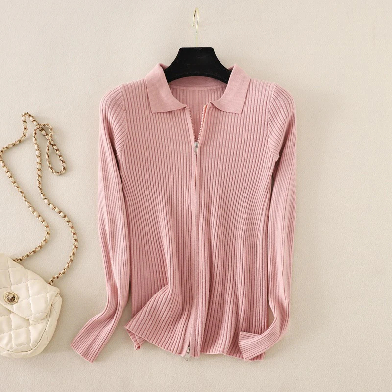 DEANWANGKT New new knitted bottoming shirt solid color slim top long sleeve polo collar women's short sweater autumn and winter