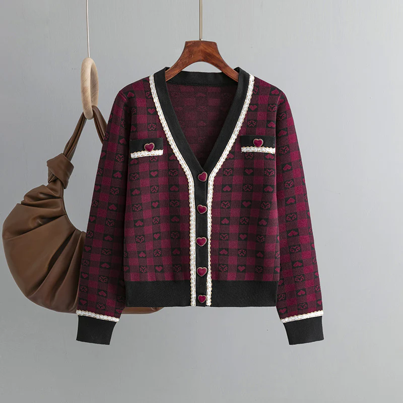 DEANWANGKT small fragrant style love plaid contrasting color knitted sweater jacket women's autumn and winter fashion light luxury high-end cardigan top