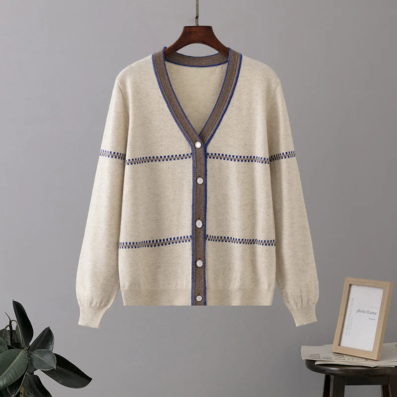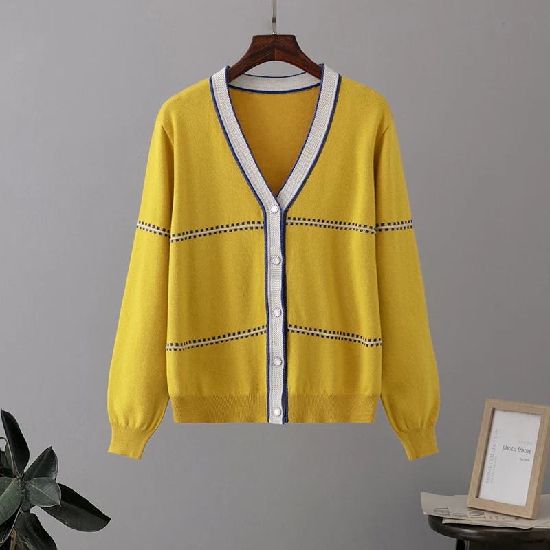 DEANWANGKT new sweater women's loose V-neck thousand bird grid long-sleeved knitted cardigan jacket contrasting colors