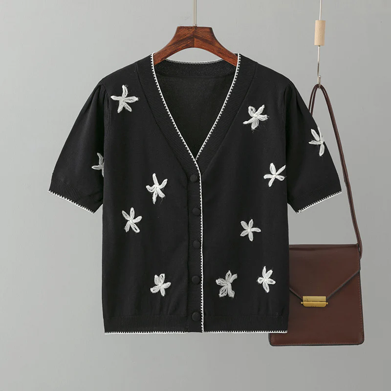 DEANWANGKT Short-sleeved ice silk knitted cardigan women's summer thin fashion Korean version temperament versatile embroidered small short top