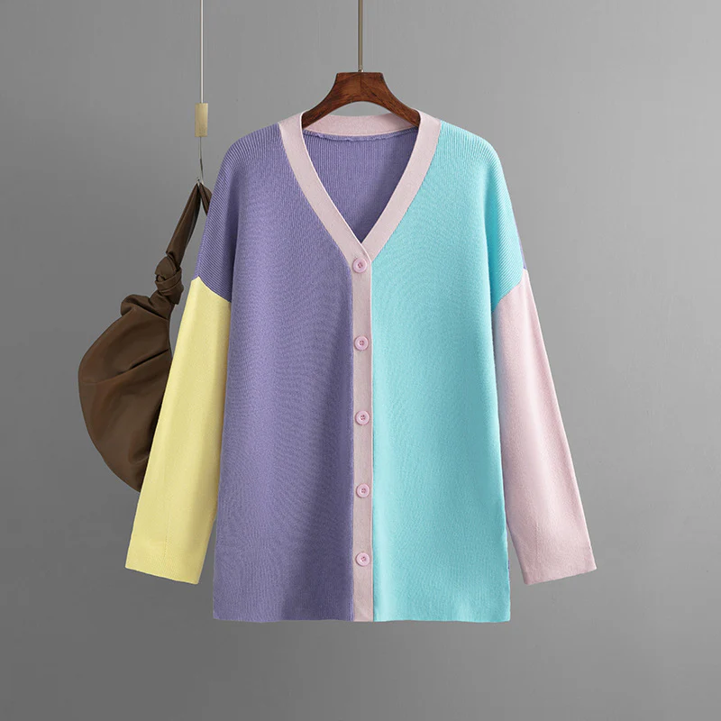 DEANWANGKT 2025 2025 trade cross-border women's clothing new color matching knitted cardigan contrasting color sweater women's loose long-sleeved medium and long coat