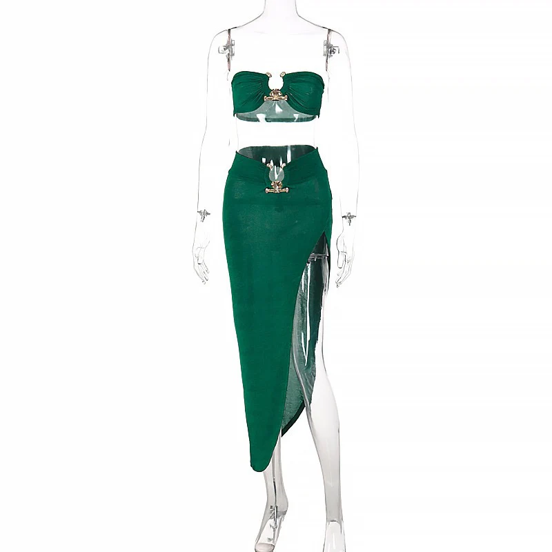 DEANWANGKT 2025 style New Popular trade women's clothing Spice Girls niche metal decoration sexy exposed button tube top half open fork women's medium and long dress