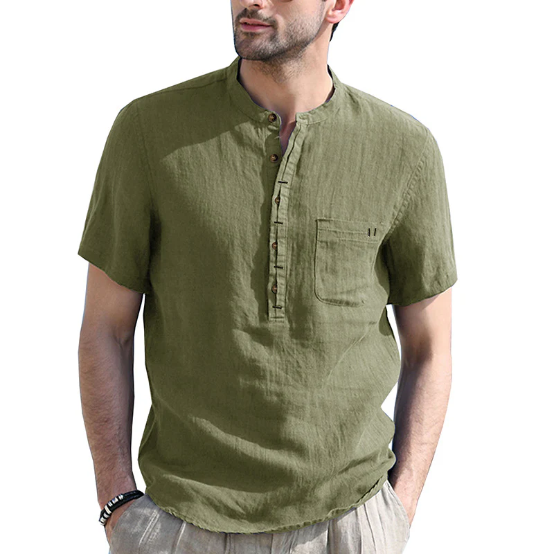 DEANWANGKT 2025 Hot trade New men's clothing Henry collar solid color pocket short-sleeved shirt men's cotton and linen shirt wholesale
