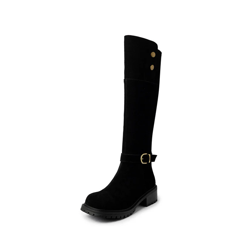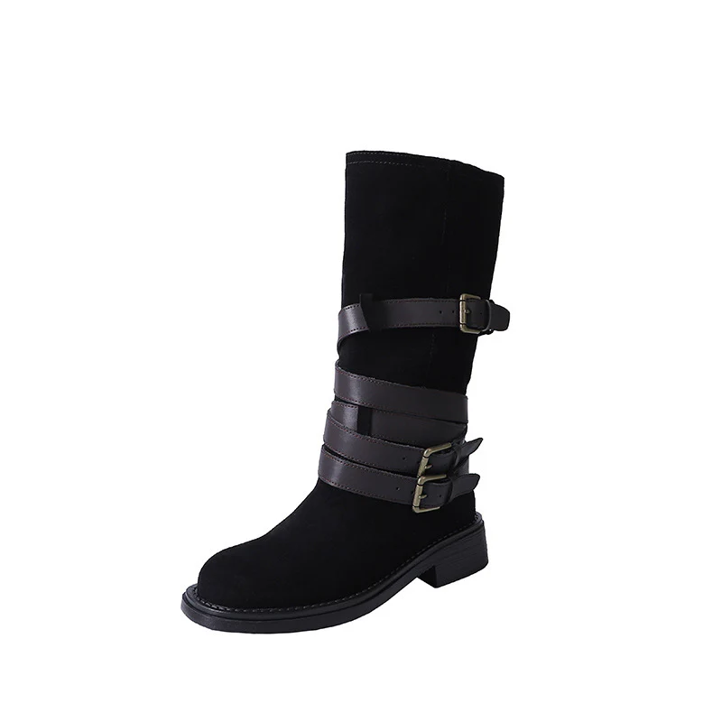 2025 Belt Buckle Medium Boots Women's Velvet Skinny Pile Boots Strap Western Cowboy Boots Brown Knight Boots