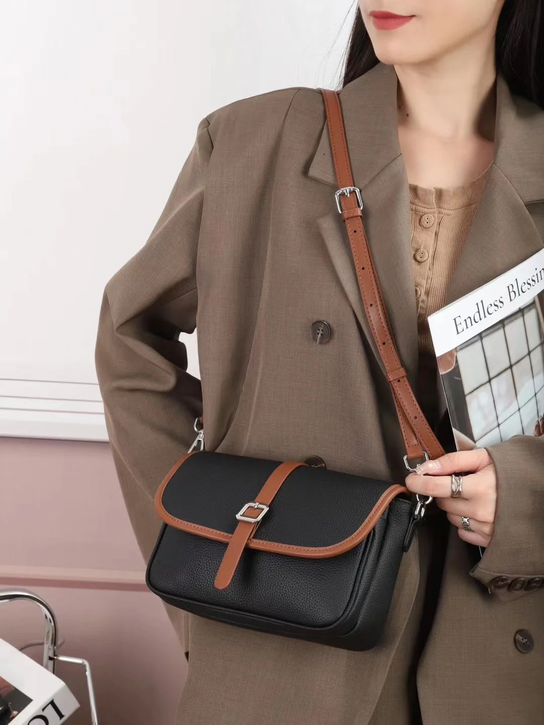 New leather women's bag first layer cowhide TOGO leather contrasting color messenger bag women's small square bag casual versatile bag cover 602