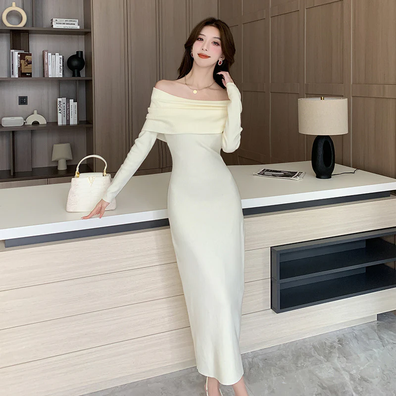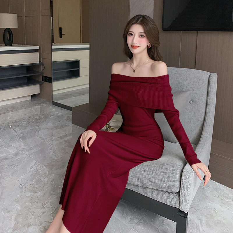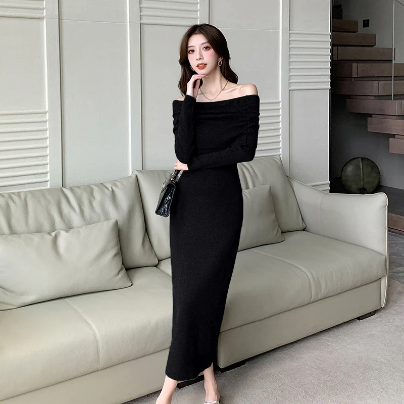 2025 One-word shoulder dress women's autumn and winter senior sense imperial sister slim and thin long sleeves beautiful off-the-shoulder stepmother hip wrap skirt
