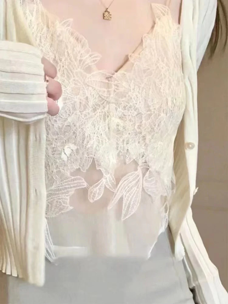 2025 popular Spring Coffee Break Pure Desire High Sense Small Fragrance Lace Suspender Bottom Knitted Cardigan Top Women