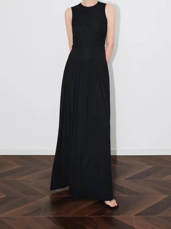 2025 popular summer new knitted thin round neck splicing sleeveless long dress women's versatile thin Muse skirt