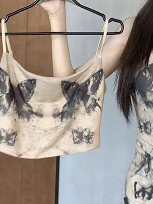 2025 Summer Butterfly Spice Girl Dress Women's Ink Printing Waist Slim A-word Suspender Hip Wrap Skirt