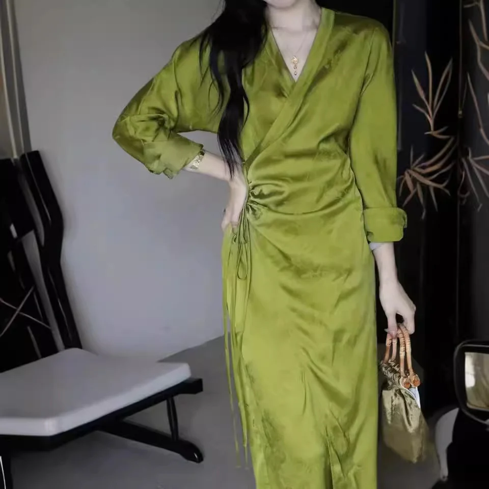 2025 Spot popular Spring and Summer New Chinese Light National Style Improved Cheongsam Premium Sense Oblique Tie Satin Dress Women