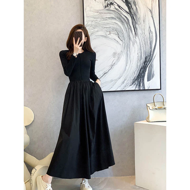 2025 Spot Yi Mengling cos wind long dress versatile new long-sleeved inner knitted waist splicing dress