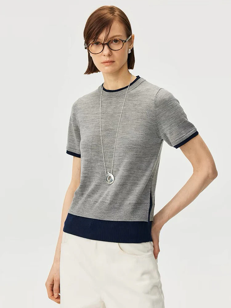 Siyuan M1U wind silk wool contrasting color fake two pieces thin knitted short-sleeved T-shirt women's thin stacking artifact 9068