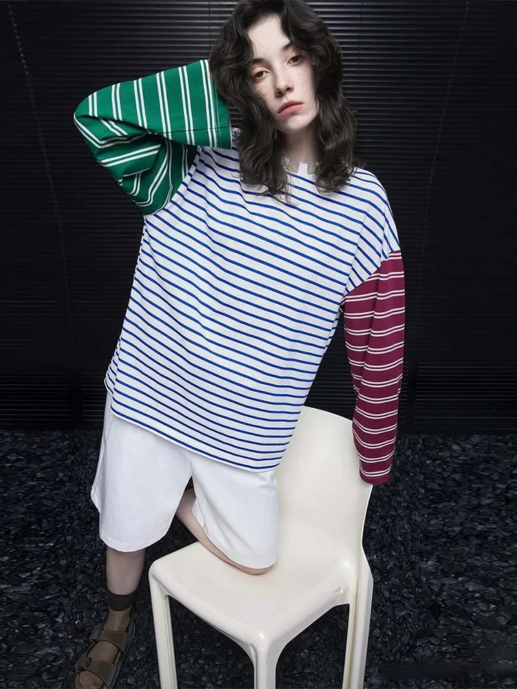 Siyuan 25 Spring and Summer Designer Loose Cotton Striped Knitted Collar Color Matching Short Sleeve + Long Sleeve T-Shirt 8965 + 896