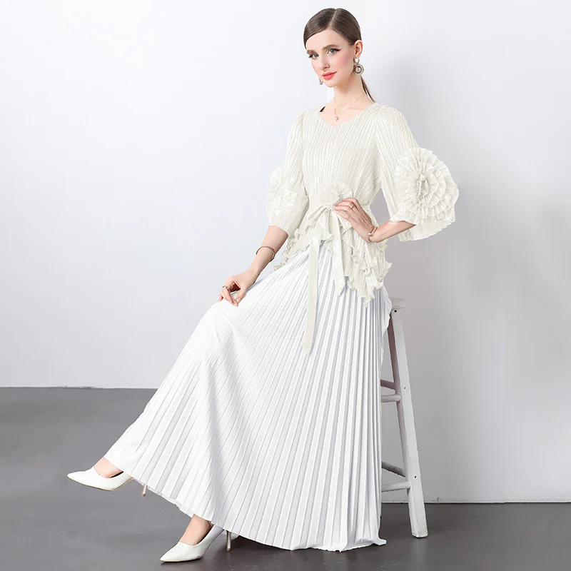 Pleated temperament suit spring and summer new fashion and thin large size personalized top + pleated skirt two-piece set for women