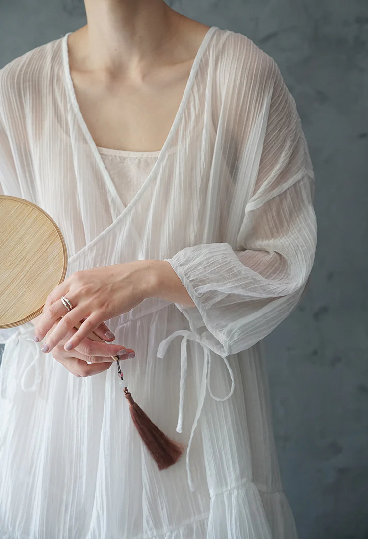 Literary casual bat-sleeved loose ramie shirt, versatile commuter transparent shawl sunshade top W23111