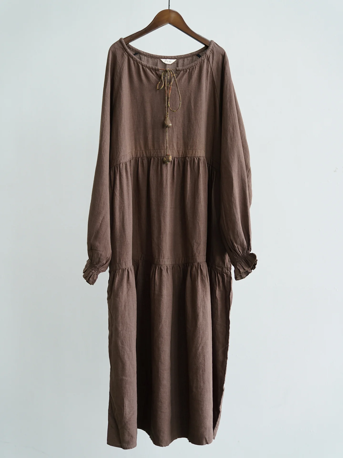 design retro linen tower skirt robe, old literary loose drawstring super long dress L24086