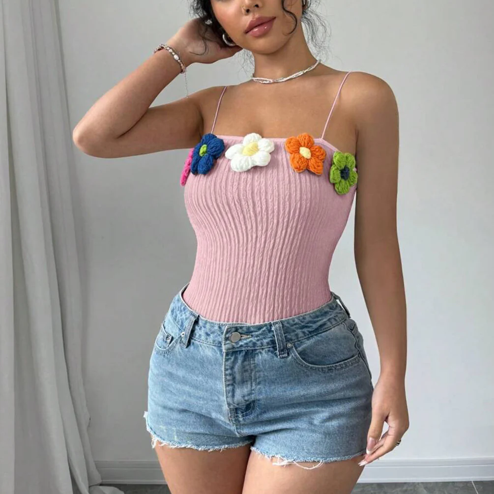 Summer new fashion design chic knitted three-dimensional flowers highlight the figure Spice girl three-dimensional onesie women's clothing