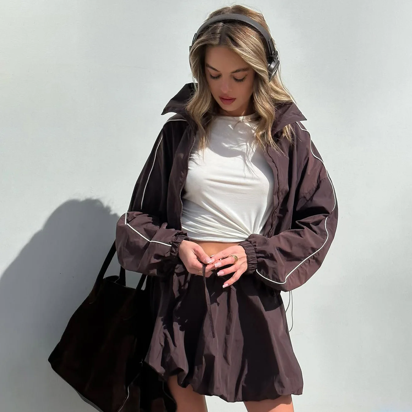 n quick-drying sports suit turtleneck long-sleeved contrasting coat drawstring bud short skirt two-piece set female tide brand high street