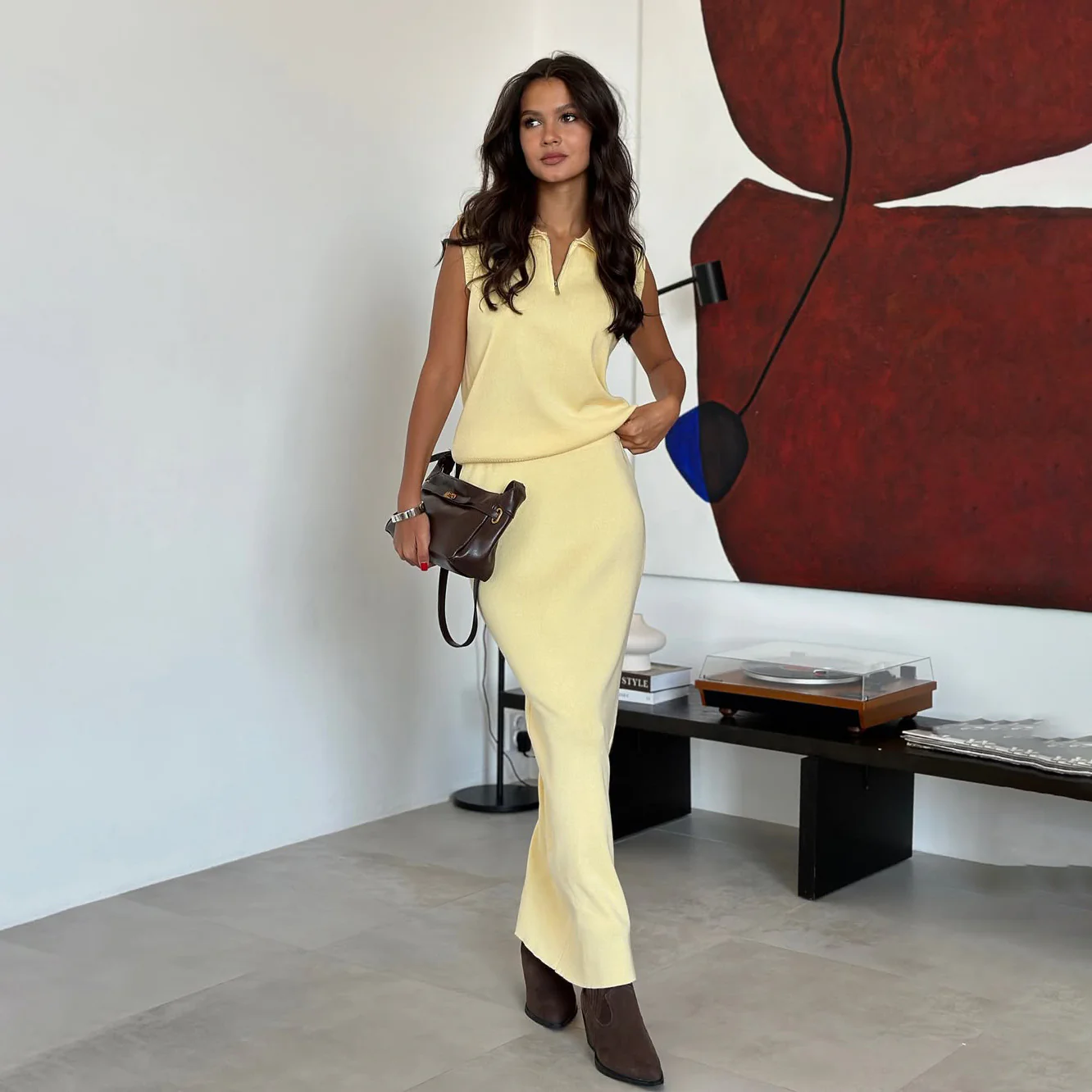 Popular trade new casual fashion lapel zipper sleeveless top hip wrap long skirt knitted suit solid color simple